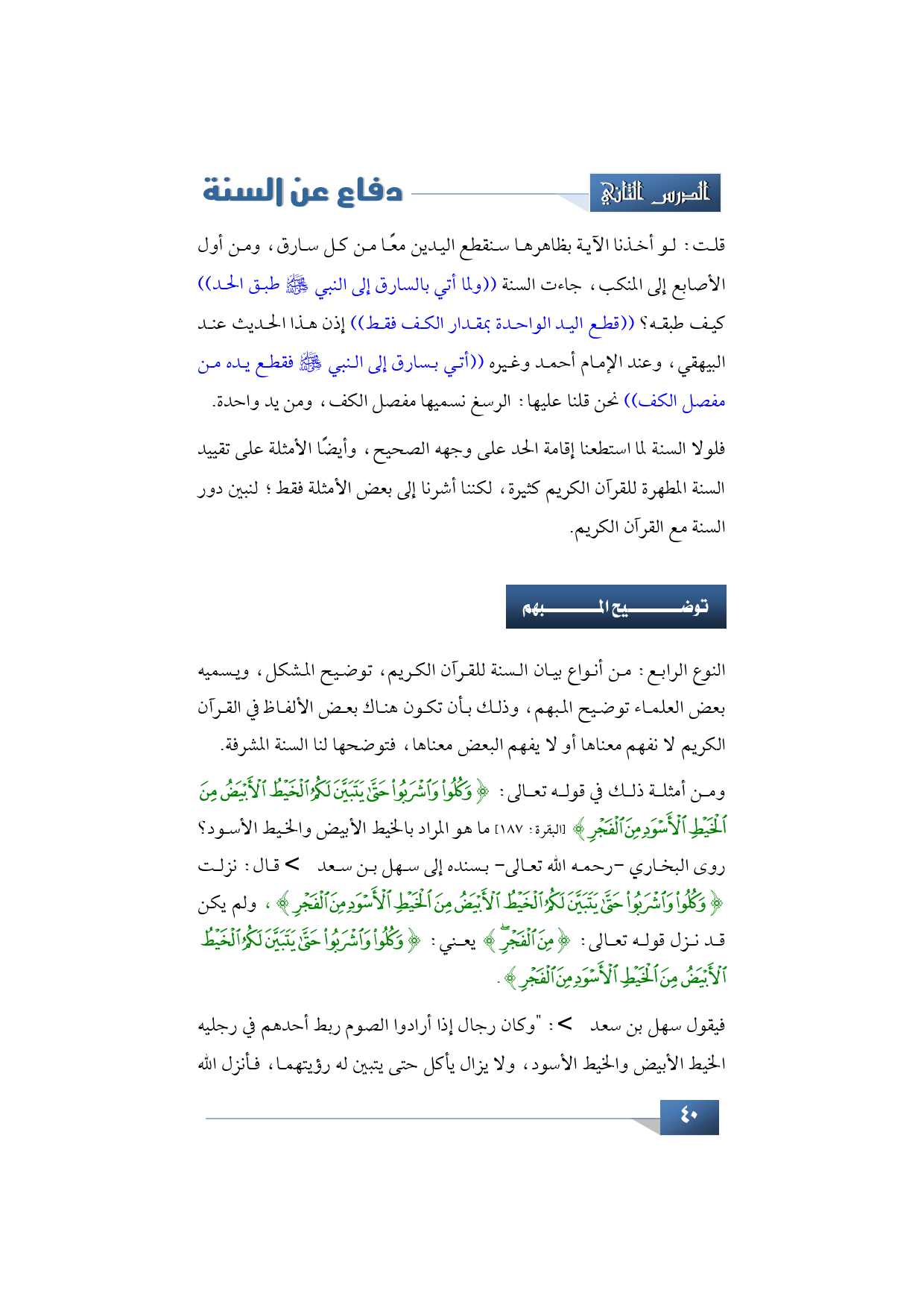 قلت: لو أخذنا الآية بظاهرها سنقطع اليدين معًا من كل سارق، ومن أول الأصابع إلى المنكب، جاءت السنة ((ولما أتي بالسارق إلى النبي -صلى الله عليه وسلم- طبق الحد)) كيف طبقه؟ ((قطع اليد الواحدة بمقدار الكف فقط)) إذن هذا الحديث موجود في كتب السنة عند البيهقي، وعند الإمام أحمد وغيره ((أتي بسارق إلى النبي -صلى الله عليه وسلم- فقطع يده من مفصل الكف)) نحن قلنا عليها: الرسغ،، نسميها مفصل الكف، ومن يد واحدة.
