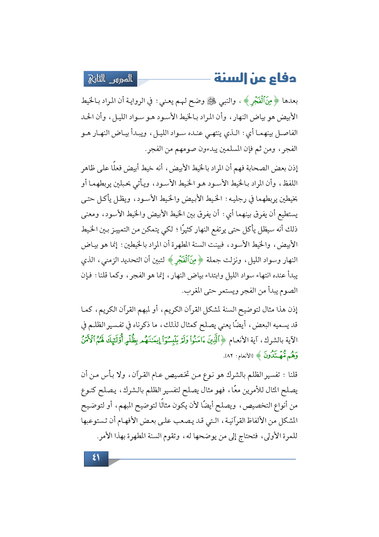إذن بعض الصحابة فهم أن المراد بالخيط الأبيض، أنه خيط أبيض فعلًا على ظاهر اللفظ، وأن المراد بالخيط الأسود هو الخيط الأسود، ويأتي بحبلين يربطهما أو بخيطين يربطهما في رجليه: الخيط الأبيض والخيط الأسود، ويظل يأكل حتى يستطيع أن يفرق بينهما أي: أن يفرق بين الخيط الأبيض والخيط الأسود، ومعنى ذلك أنه سيظل يأكل حتى يرتفع النهار كثيرًا؛ لكي يتمكن من التمييز بين الخيط الأبيض، والخيط الأسود، فبينت السنة المطهرة أن المراد بالخيطين: إنما هو بياض النهار وسواد الليل، ونزلت جملة {مِنَ الْفَجْرِ} لتبين أن التحديد الزمني، الذي يبدأ عنده انتهاء سواد الليل وابتداء بياض النهار، إنما هو الفجر، وكما قلنا: فإن الصوم يبدأ من الفجر ويستمر حتى المغرب.