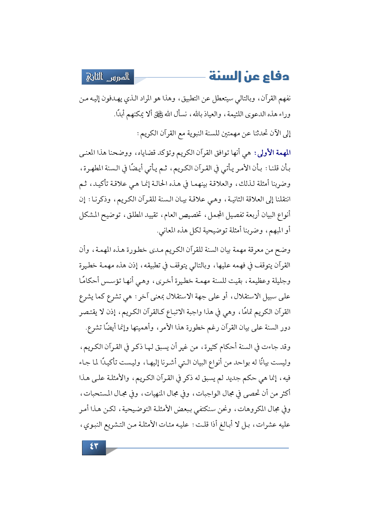 إلى الأن تكلمنا عن مهمتين للسنة النبوية مع القرآن الكريم: المهمة الأولى: هي أنها توافق القرآن الكريم وتؤكد قضاياه، ووضحنا هذا المعنى بأن قلنا: بأن الأمر يأتي في القرآن الكريم، ثم يأتي أيضًا في السنة المطهرة، وضربنا أمثلة لذلك، والعلاقة بينهما في هذه الحالة إنما هي علاقة تأكيد، ثم انتقلنا إلى العلاقة الثانية، وهي علاقة بيان السنة للقرآن الكريم، وقلنا: إن أنواع البيان أربعة تفصيل المجمل، تخصيص العام، تقييد المطلق، توضيح المشكل أو المبهم، وضربنا أمثلة توضيحية لكل هذه المعاني.