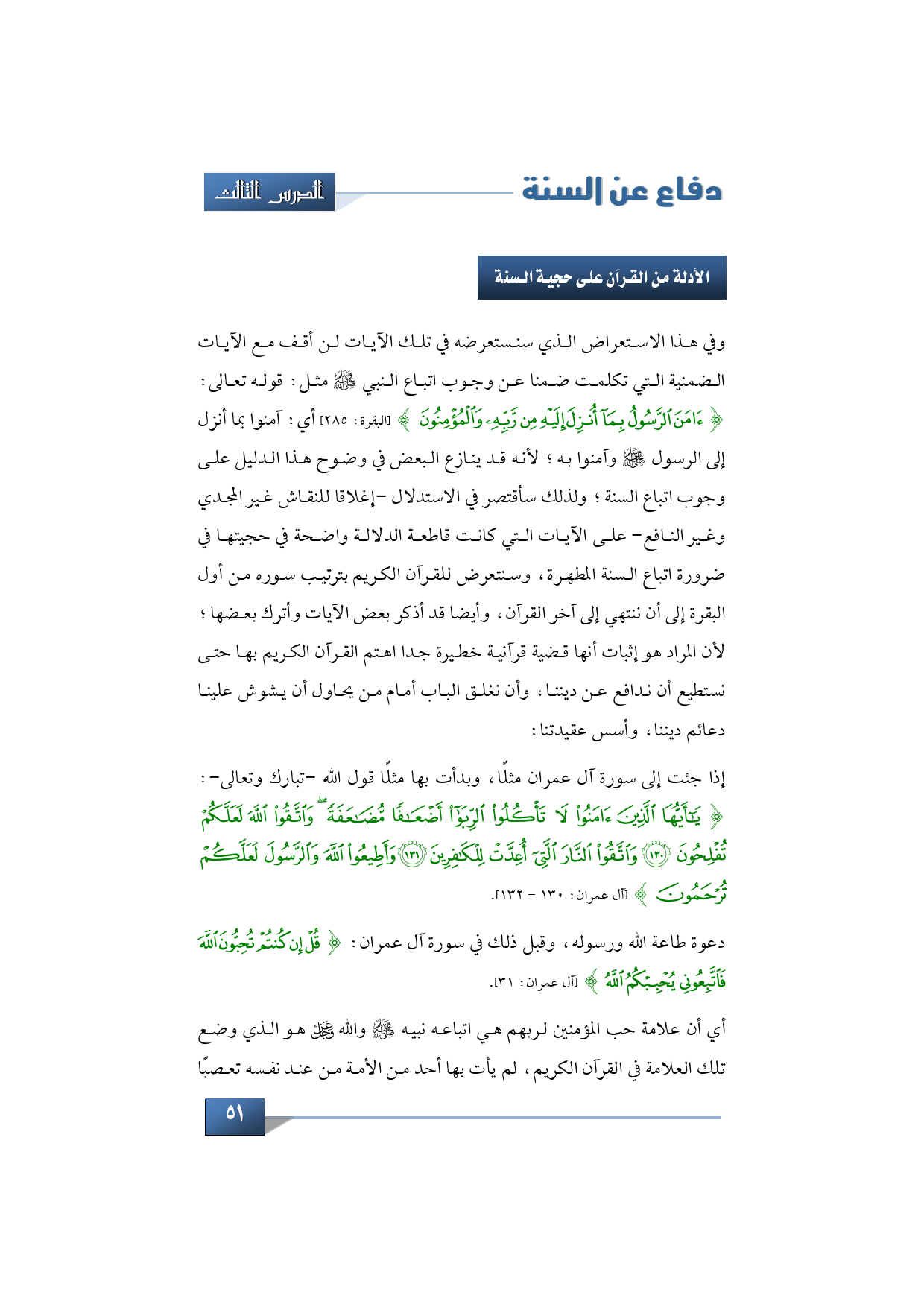 وفي هذا الاستعراض الذي سنستعرضه في تلك الآيات لن أقف مع الآيات الضمنية التي تكلمت ضمنا عن وجوب اتباع النبي -صلى الله عليه وسلم- مثل: قوله تعالى: {آمَنَ الرَّسُولُ بِمَا أُنْزِلَ إِلَيْهِ مِنْ رَبِّهِ وَالْمُؤْمِنُونَ} (البقرة: 285)، أي: آمنوا بما أنزل إلى الرسول -صلى الله عليه وسلم- وآمنوا به؛ لأنه قد ينازع البعض في وضوح هذا الدليل على وجوب اتباع السنة؛ ولذلك سأقتصر في الاستدلال -إغلاقا للنقاش غير المجدي وغير النافع- على الآيات التي كانت قاطعة الدلالة واضحة في حجيتها في ضرورة اتباع السنة المطهرة، وسنتعرض للقرآن الكريم بترتيب سوره من أول البقرة إلى أن ننتهي إلى آخر القرآن، وأيضا قد أذكر بعض الآيات وأترك بعضها؛ لأن المراد هو إثبات أنها قضية قرآنية خطيرة جدا اهتم القرآن الكريم بها حتى نستطيع أن ندافع عن ديننا، وأن غلق الباب أمام من يحاول أن يشوش علينا دعائم ديننا وأسس عقيدتنا: