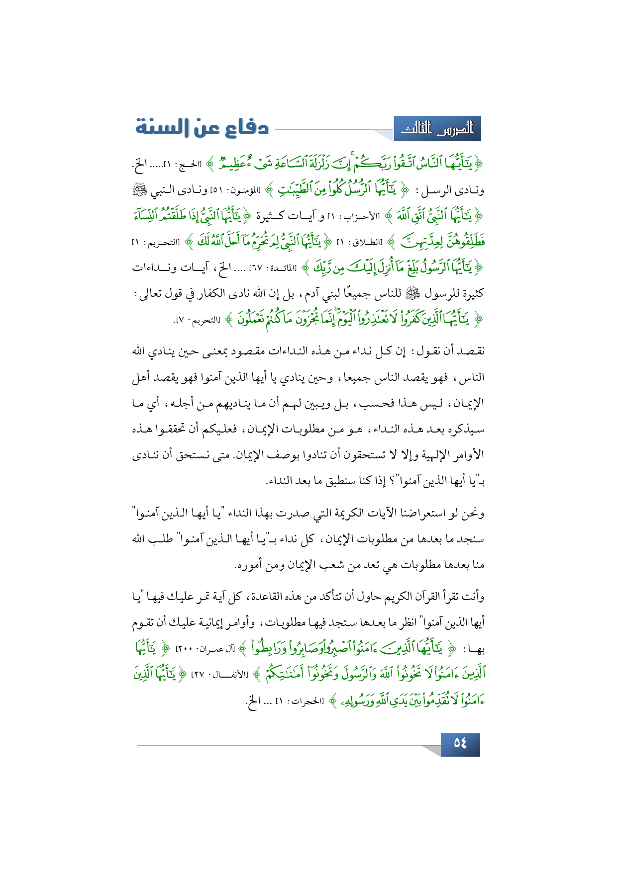 وأنت تقرأ القرآن الكريم حاول أن تتأكد من هذه القاعدة، كل آية تمر عليك فيها "يا أيها الذين آمنوا" انظر ما بعدها ستجد فيها مطلوبات وأوامر إيمانية عليك أن تقوم بها: {يَا أَيُّهَا الَّذِينَ آمَنُوا اصْبِرُوا وَصَابِرُوا وَرَابِطُو} (آل عمران: 200)، {يَا أَيُّهَا الَّذِينَ آمَنُوا لَا تَخُونُوا اللَّهَ وَالرَّسُولَ وَتَخُونُوا أَمَانَاتِكُمْ} (الأنفال: 27)، {يَا أَيُّهَا الَّذِينَ آمَنُوا لَا تُقَدِّمُوا بَيْنَ يَدَيِ اللَّهِ وَرَسُولِهِ} (الحجرات: 1) ... الخ الخ.