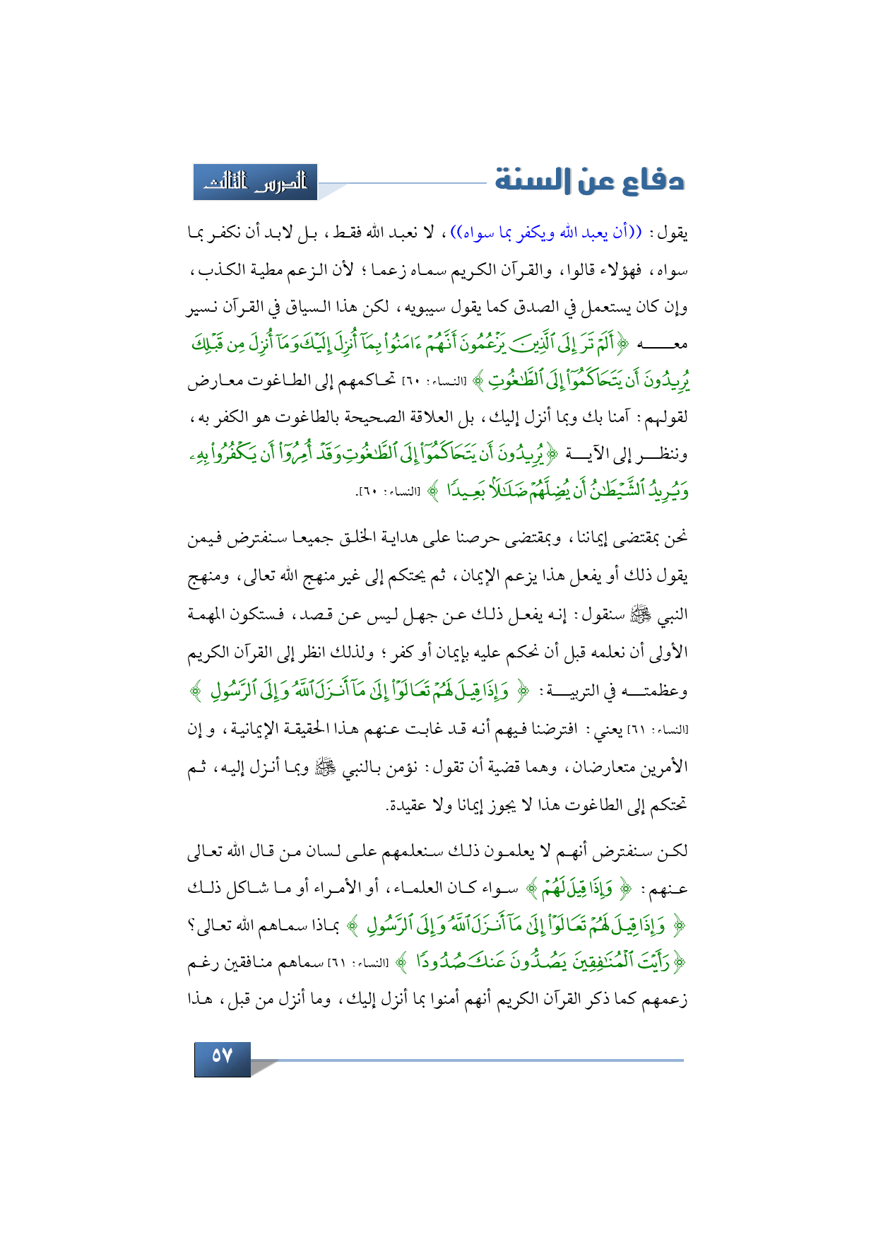 يقول: ((أن يعبد الله ويكفر بما سواه))، لا نعبد الله فقط، بل لابد أن نكفر بما سواه، فهؤلاء قالوا، والقرآن الكريم سماه زعما؛ لأن الزعم مطية الكذب، وإن كان يستعمل في الصدق كما يقون سيبويه، لكن هذا السياق في القرآن نسير معه {أَلَمْ تَرَ إِلَى الَّذِينَ يَزْعُمُونَ أَنَّهُمْ آمَنُوا بِمَا أُنْزِلَ إِلَيْكَ وَمَا أُنْزِلَ مِنْ قَبْلِكَ يُرِيدُونَ أَنْ يَتَحَاكَمُوا إِلَى الطَّاغُوتِ} (النساء: 60)، تحاكمهم إلى الطاغوت معارض لقولهم: آمنا بك وبما أنزل إليك، بل العلاقة الصحيحة بالطاغوت هو الكفر به، وننظر إلى الآية {يُرِيدُونَ أَنْ يَتَحَاكَمُوا إِلَى الطَّاغُوتِ وَقَدْ أُمِرُوا أَنْ يَكْفُرُوا بِهِ وَيُرِيدُ الشَّيْطَانُ أَنْ يُضِلَّهُمْ ضَلَالًا بَعِيدًا} (النساء: 60).