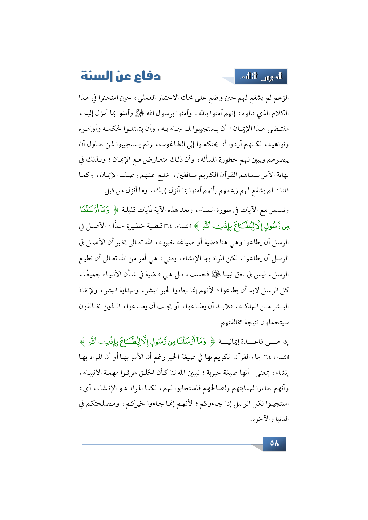 ونستمر مع الآيات في سورة النساء، وبعد هذه الآية بآيات قليلة {وَمَا أَرْسَلْنَا مِنْ رَسُولٍ إِلَّا لِيُطَاعَ بِإذا اللَّهِ} (النساء: 64) قضية خطيرة جدًّا؛ الأصل في الرسل أن يطاعوا وهي هنا قضية أو صياغة خبرية، الله تعالى يخبر أن الأصل في الرسل أن يطاعوا، لكن المراد بها الإنشاء، يعني: هي أمر من الله تعالى أن نطيع الرسل، ليس في حق نبينا -صلى الله عليه وسلم- فحسب، بل هي قضية في شأن الأنبياء جميعًا، كل الرسل لابد أن يطاعوا؛ لأنهم إنما جاءوا لخير البشر، ولهداية البشر، ولإنقاذ البشر من الهلكة، فلابد أن يطاعوا، أو يجب أن يطاعوا، الذين يخالفون سيتحملون نتيجة مخالفتهم.