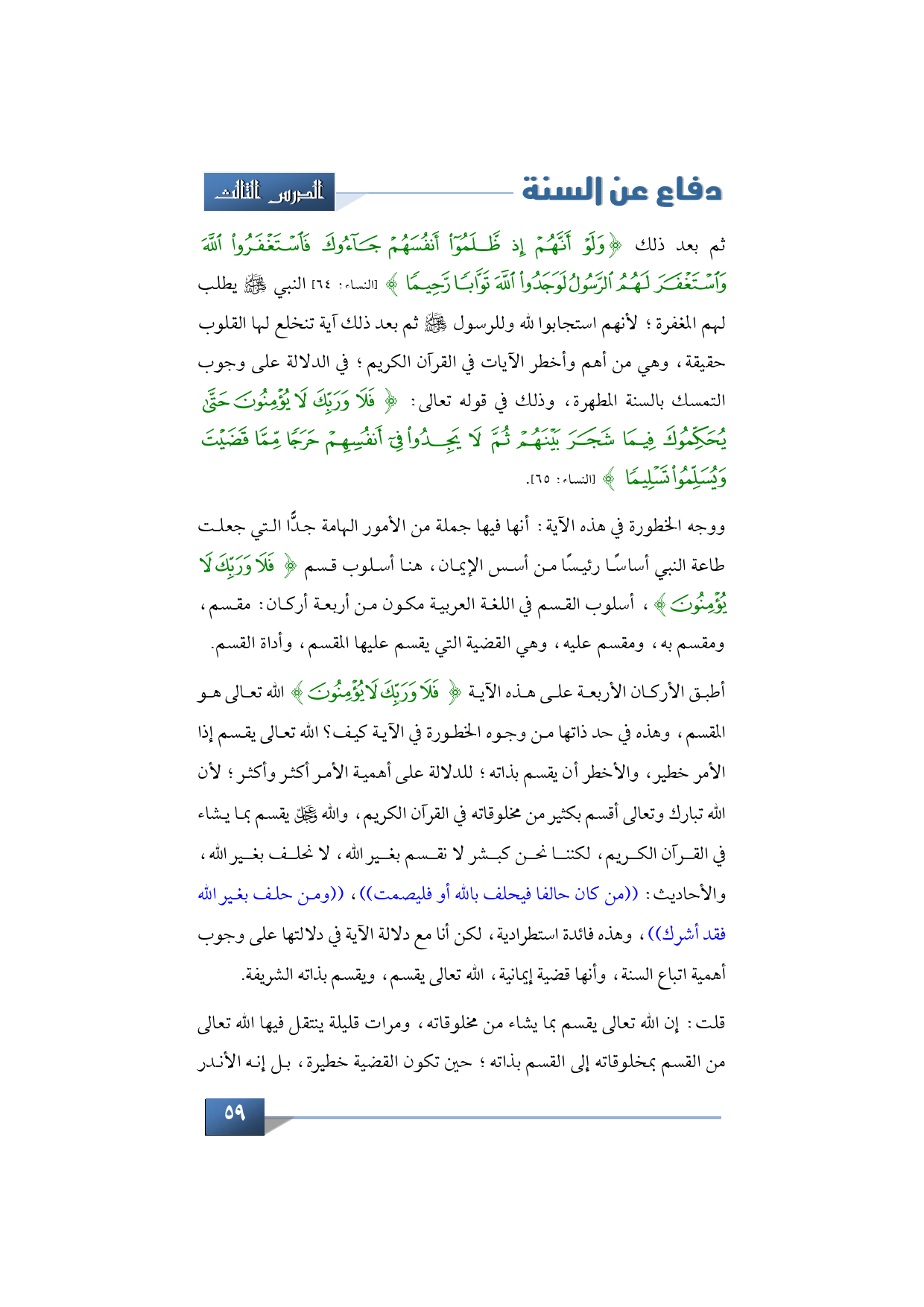 أطبق الأركان الأربعة على هذه الآية {فَلَا وَرَبِّكَ لَا يُؤْمِنُونَ} الله تعالى هو المقسم، وهذه في حد ذاتها من وجوه الخطورة في الآية كيف؟ الله تعالى يقسم إذا الأمر خطير، والأخطر أن يقسم بذاته؛ للدلالة على أهمية الأمر أكثر وأكثر؛ لأن الله تبارك وتعالى أقسم بكثير من مخلوقاته في القرآن الكريم، والله -عز وجل- يقسم بما يشاء في القرآن الكريم، لكننا نحن كبشر لا نقسم بغير الله، لا نحلف بغير الله، والأحاديث: ((من كان حالفا فيحلف بالله أو فليصمت))، ((ومن حلف بغير الله فقد أشرك))، وهذه فائدة استطرادية، لكن أنا مع دلالة الآية في دلالتها على وجوب أهمية اتباع السنة، وأنها قضية إيمانية، الله تعالى يقسم، ويقسم بذاته الشريفة.