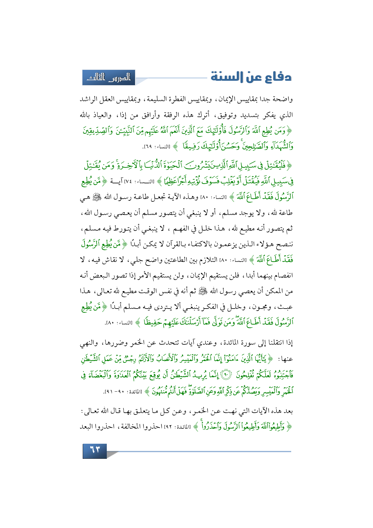 {فَلْيُقَاتِلْ فِي سَبِيلِ اللَّهِ الَّذِينَ يَشْرُونَ الْحَيَاةَ الدُّنْيَا بِالْآخِرَةِ وَمَنْ يُقَاتِلْ فِي سَبِيلِ اللَّهِ فَيُقْتَلْ أَوْ يَغْلِبْ فَسَوْفَ نُؤْتِيهِ أَجْرًا عَظِيمًا} (النساء: 74) آية {مَنْ يُطِعِ الرَّسُولَ فَقَدْ أَطَاعَ اللَّهَ} (النساء: 80) هذه الآية تجعل طاعة رسول الله -صلى الله عليه وسلم- هي طاعة لله، ولا يوجد مسلم، أو لا ينبغي أن يتصور مسلم أن يعصي رسول الله، ثم يتصور أنه مطيع لله، هذا خلل في الفهم، لا ينبغي أن يتورط فيه مسلم، ننصح هؤلاء الذين يزعمون بالاكتفاء بالقرآن لا يمكن أبدًا {مَنْ يُطِعِ الرَّسُولَ فَقَدْ أَطَاعَ اللَّهَ} (النساء: 80)، التلازم بين الطاعتين واضح جلي، لا نقاش فيه، لا انفصام بينهما أبدا، فلن يستقيم الإيمان، ولن يستقيم الأمر إذا تصور البعض أنه من الممكن أن يعصي رسول الله -صلى الله عليه وسلم-، ثم أنه في نفس الوقت مطيع لله تعالى، هذا عبث، ومجون، وخلل في الفكر ينبغي ألا يتردى فيه مسلم أبدًا {مَنْ يُطِعِ الرَّسُولَ فَقَدْ أَطَاعَ اللَّهَ وَمَنْ تَوَلَّى فَمَا أَرْسَلْنَاكَ عَلَيْهِمْ حَفِيظًا} (النساء: 80).