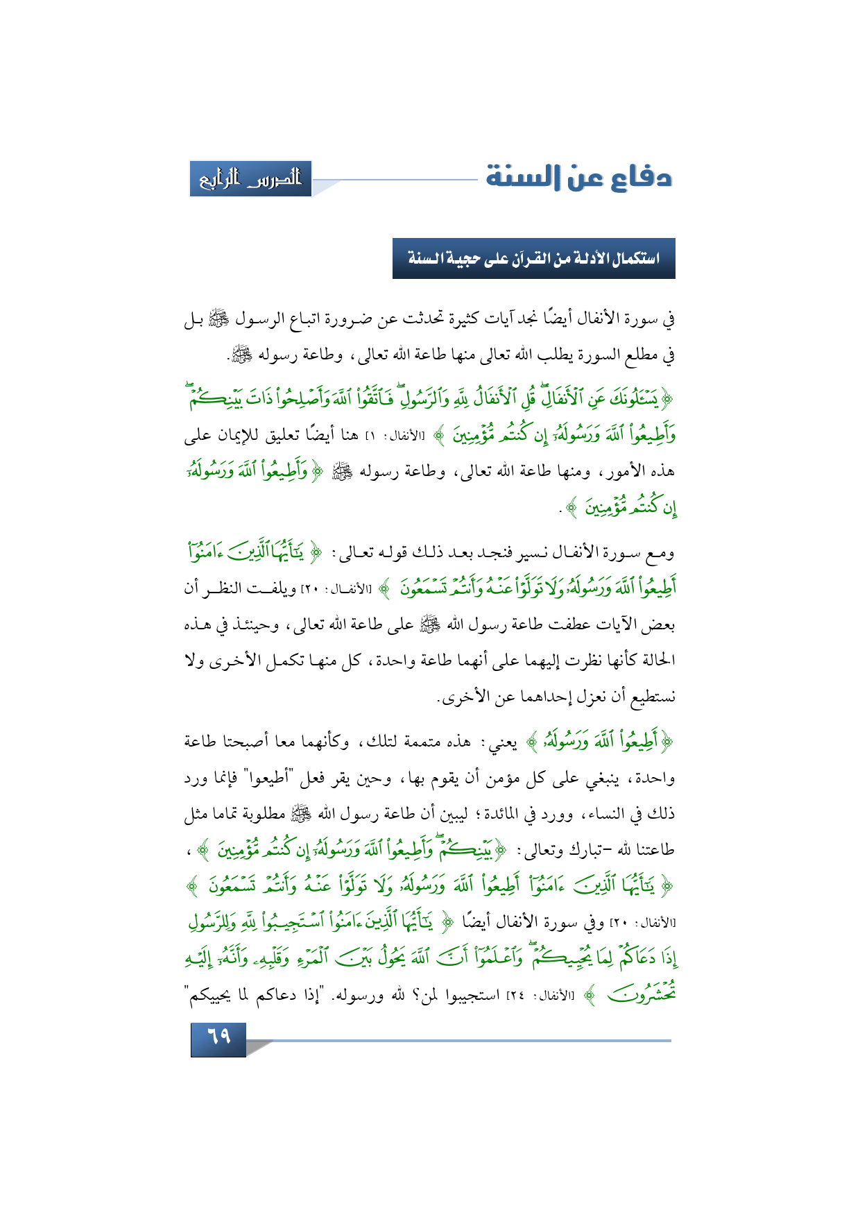 في سورة الأنفال أيضًا نجد آيات كثيرة تحدثت عن ضرورة اتباع الرسول -صلى الله عليه وسلم- بل في مطلع السورة يطلب الله تعالى منها طاعة الله تعالى، وطاعة رسوله -صلى الله عليه وسلم-.