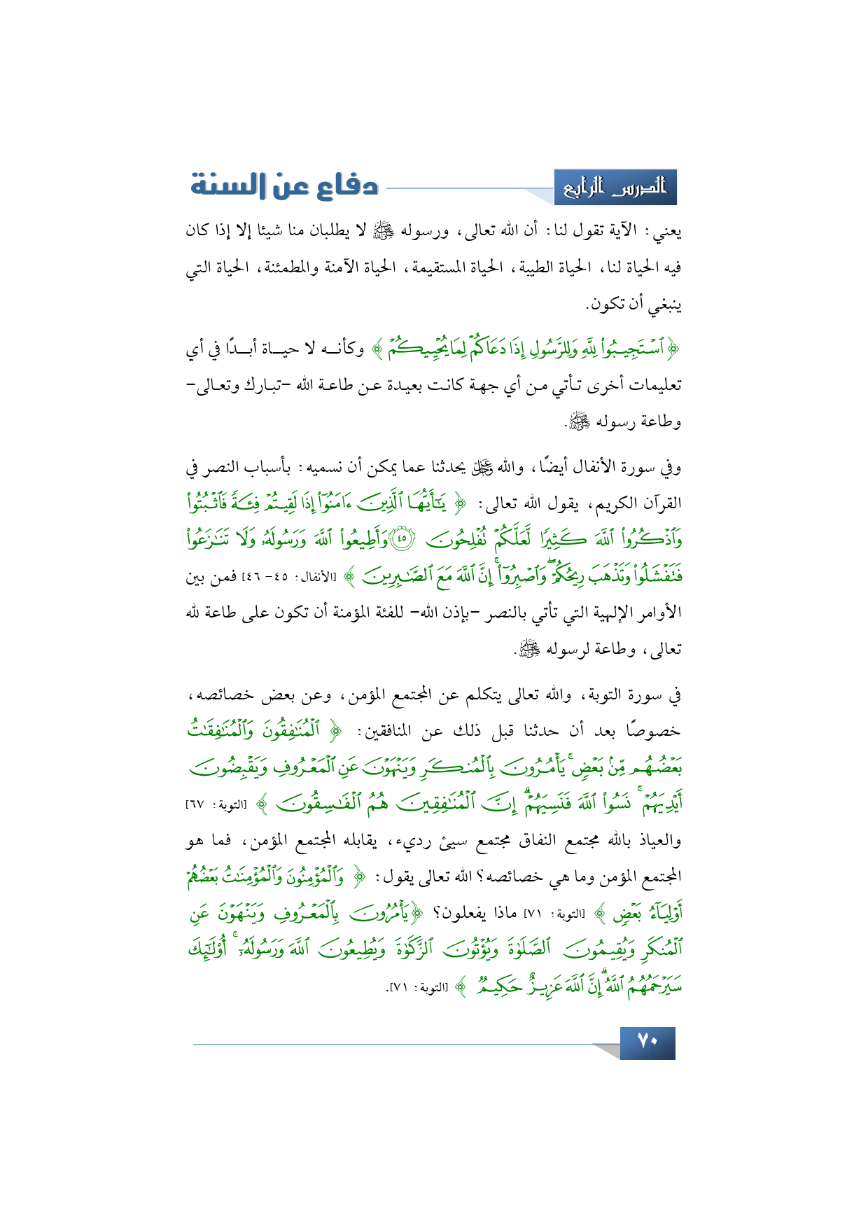 في سورة التوبة، والله تعالى يتكلم عن المجتمع المؤمن، وعن بعض خصائصه، خصوصًا بعد أن حدثنا قبل ذلك عن المنافقين: {الْمُنَافِقُونَ وَالْمُنَافِقَاتُ بَعْضُهُمْ مِنْ بَعْضٍ يَأْمُرُونَ بِالْمُنْكَرِ وَيَنْهَوْنَ عَنِ الْمَعْرُوفِ وَيَقْبِضُونَ أَيْدِيَهُمْ نَسُوا اللَّهَ فَنَسِيَهُمْ إِنَّ الْمُنَافِقِينَ هُمُ الْفَاسِقُونَ} (التوبة: 67)، والعياذ بالله مجتمع النفاق مجتمع سيئ رديء، يقابله المجتمع المؤمن، فما هو المجتمع المؤمن وما هي خصائصه؟ الله تعالى يقول: {وَالْمُؤْمِنُونَ وَالْمُؤْمِنَاتُ بَعْضُهُمْ وَالْمُؤْمِنُونَ وَالْمُؤْمِنَاتُ بَعْضُهُمْ} (التوبة: 71) ماذا يفعلون؟ {يَأْمُرُونَ بِالْمَعْرُوفِ وَيَنْهَوْنَ عَنِ الْمُنْكَرِ وَيُقِيمُونَ الصَّلَاةَ وَيُؤْتُونَ الزَّكَاةَ وَيُطِيعُونَ اللَّهَ وَرَسُولَهُ أُولَئِكَ سَيَرْحَمُهُمُ اللَّهُ إِنَّ اللَّهَ عَزِيزٌ حَكِيمٌ} (التوبة: 71).