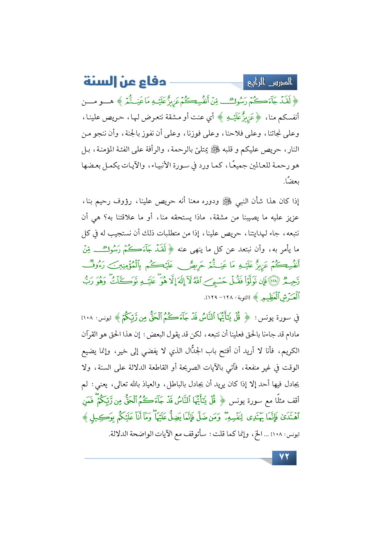 في سورة يونس: {قُلْ يَا أَيُّهَا النَّاسُ قَدْ جَاءَكُمُ الْحَقُّ مِنْ رَبِّكُمْ} (يونس: 108) مادام قد جاءنا بالحق فعلينا أن نتبعه، لكن قد يقول البعض: إن هذا الحق هو القرآن الكريم، فأنا لا أريد أن أفتح باب الجدًّال الذي لا يفضي إلى خير، وإنما يضيع الوقت في غير منفعة، فآتي بالآيات الصريحة أو القاطعة الدلالة على السنة، ولا يجادل فيها أحد إلا إذا كان يريد أن يجادل بالباطل، والعياذ بالله تعالى، يعني: لم أقف مثلًا مع سورة يونس {قُلْ يَا أَيُّهَا النَّاسُ قَدْ جَاءَكُمُ الْحَقُّ مِنْ رَبِّكُمْ فَمَنِ اهْتَدَى فَإِنَّمَا يَهْتَدِي لِنَفْسِهِ وَمَنْ ضَلَّ فَإِنَّمَا يَضِلُّ عَلَيْهَا وَمَا أَنَا عَلَيْكُمْ بِوَكِيلٍ} (يونس: 108) ... الخ، وإنما كما قلت: سأتوقف مع الآيات الواضحة الدلالة.