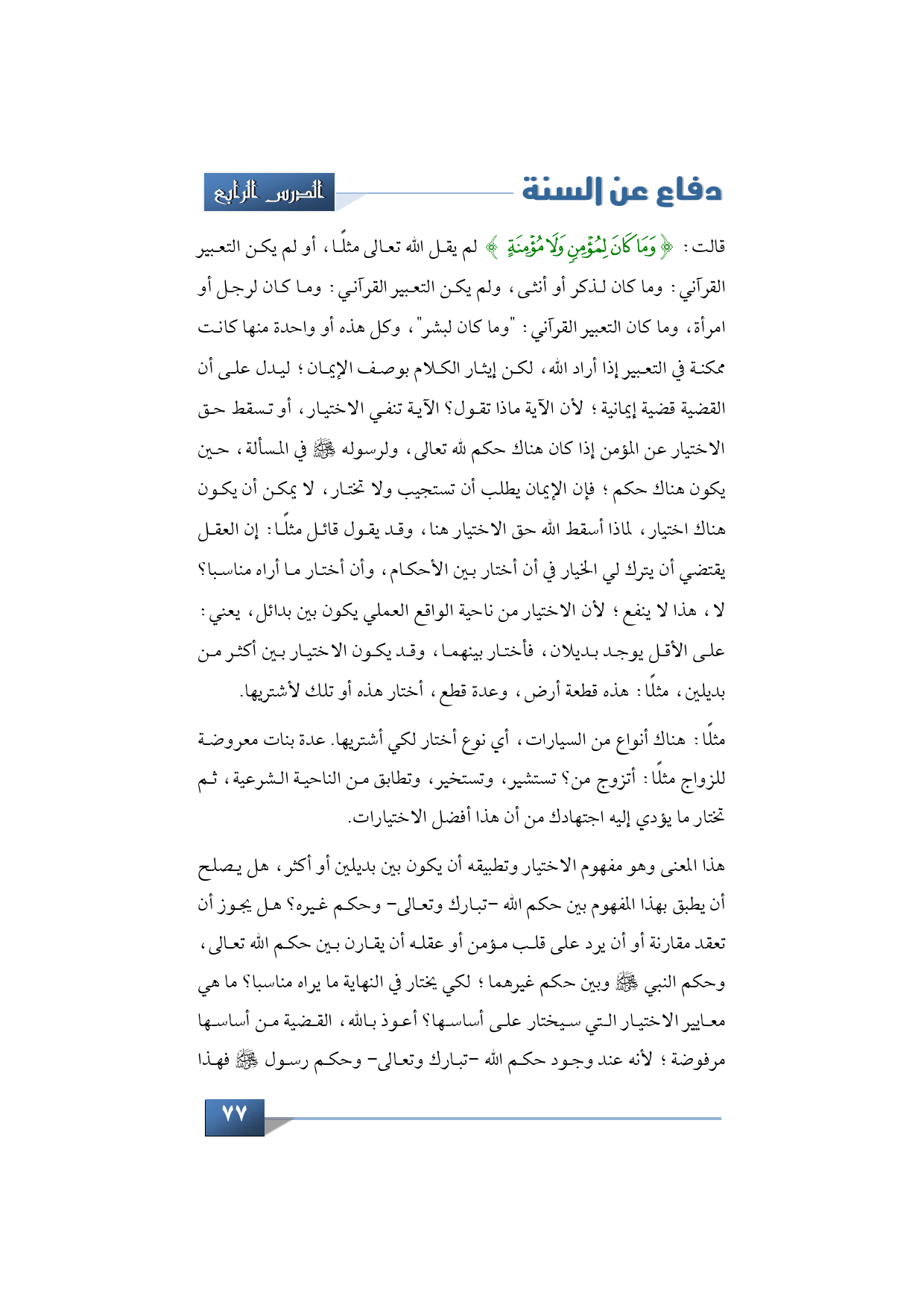 قالت: {وَمَا كَانَ لِمُؤْمِنٍ وَلَا مُؤْمِنَةٍ} لم يقل الله تعالى مثلًا، أو لم يكن التعبير القرآني: وما كان لذكر أو أنثى، ولم يكن التعبير القرآني: وما كان لرجل أو امرأة، وما كان التعبير القرآني: "وما كان لبشر"، وكل هذه أو واحدة منها كانت ممكنة في التعبير إذا أراد الله، لكن إيثار الكلام بوصف الإيمان؛ ليدل على أن القضية قضية إيمانية؛ لأن الآية ماذا تقول؟ الآية تنفي الاختيار، أو تسقط حق الاختيار عن المؤمن إذا كان هناك حكم لله تعالى، ولرسوله -صلى الله عليه وسلم- في المسألة، حين يكون هناك حكم؛ فإن الإيمان يطلب أن تستجيب ولا تختار، لا يمكن أن يكون هناك اختيار، لماذا أسقط الله حق الاختيار هنا، وقد يقول قائل مثلًا: إن العقل يقتضي أن يترك لي الخيار في أن أختار بين الأحكام، وأن أختار ما أراه مناسبا؟ لا، هذا لا ينفع؛ لأن الاختيار من ناحية الواقع العملي يكون بين بدائل، يعني: على الأقل يوجد بديلان، فأختار بينهما، وقد يكون الاختيار بين أكثر من بديلين، مثلًا: هذه قطعة أرض، وعدة قطع، أختار هذه أو تلك لأشتريها.