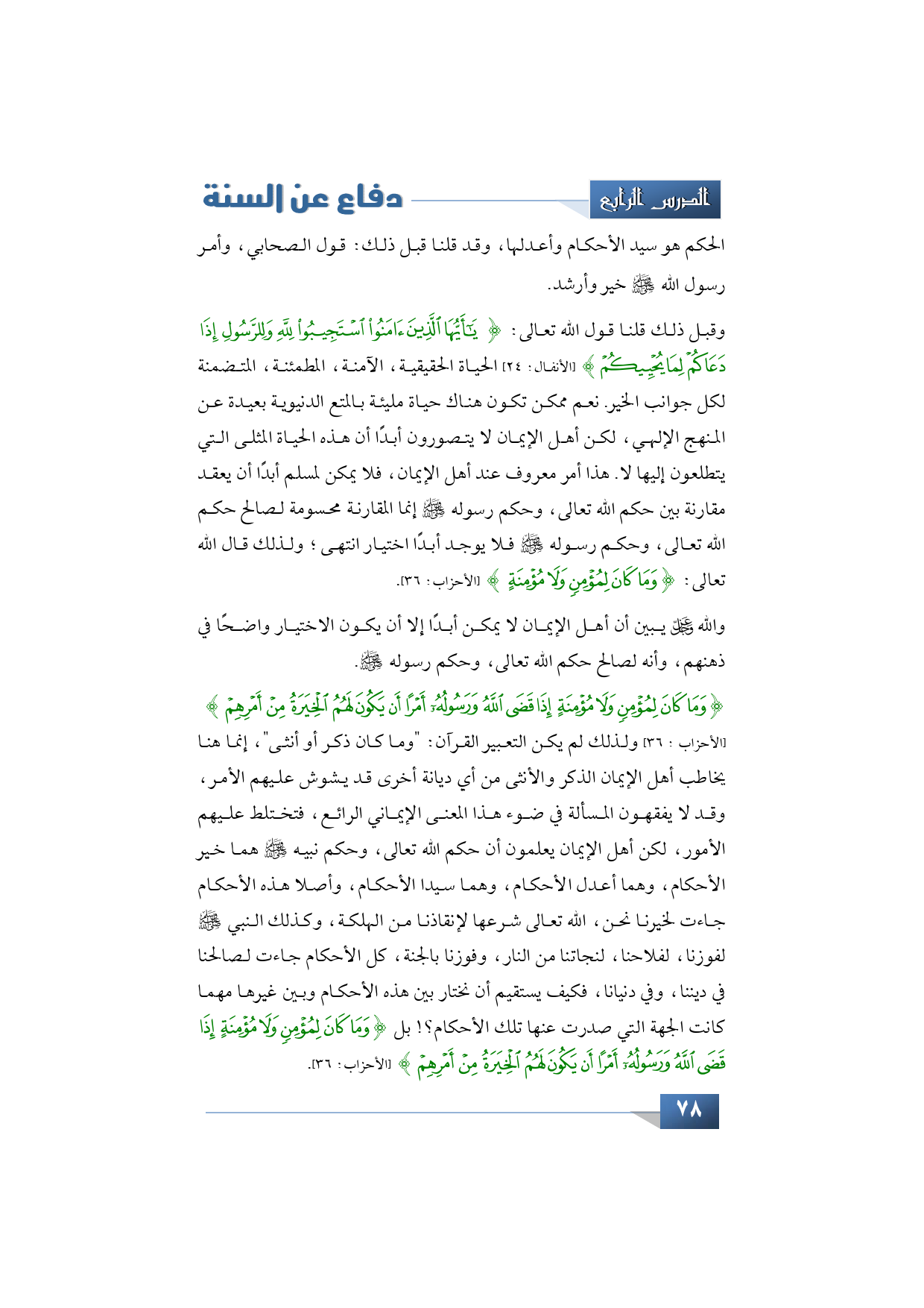 وقبل ذلك قلنا قول الله تعالى: {يَا أَيُّهَا الَّذِينَ آمَنُوا اسْتَجِيبُوا لِلَّهِ وَلِلرَّسُولِ إِذَا دَعَاكُمْ لِمَا يُحْيِيكُمْ} (الأنفال: 24) الحياة الحقيقية، الآمنة، المطمئنة، المتضمنة لكل جوانب الخير. نعم ممكن تكون هناك حياة مليئة بالمتع الدنيوية بعيدة عن المنهج الإلهي، لكن أهل الإيمان لا يتصورون أبدًا أن هذه الحياة المثلى التي يتطلعون إليها لا. هذا أمر معروف عند أهل الإيمان، فلا يمكن لمسلم أبدًا أن يعقد مقارنة بين حكم الله تعالى، وحكم رسوله -صلى الله عليه وسلم-، إنما المقارنة محسومة لصالح حكم الله تعالى، وحكم رسوله -صلى الله عليه وسلم-، فلا يوجد أبدًا اختيار انتهى؛ ولذلك قال الله تعالى: {وَمَا كَانَ لِمُؤْمِنٍ وَلَا مُؤْمِنَةٍ} (الأحزاب: 36).