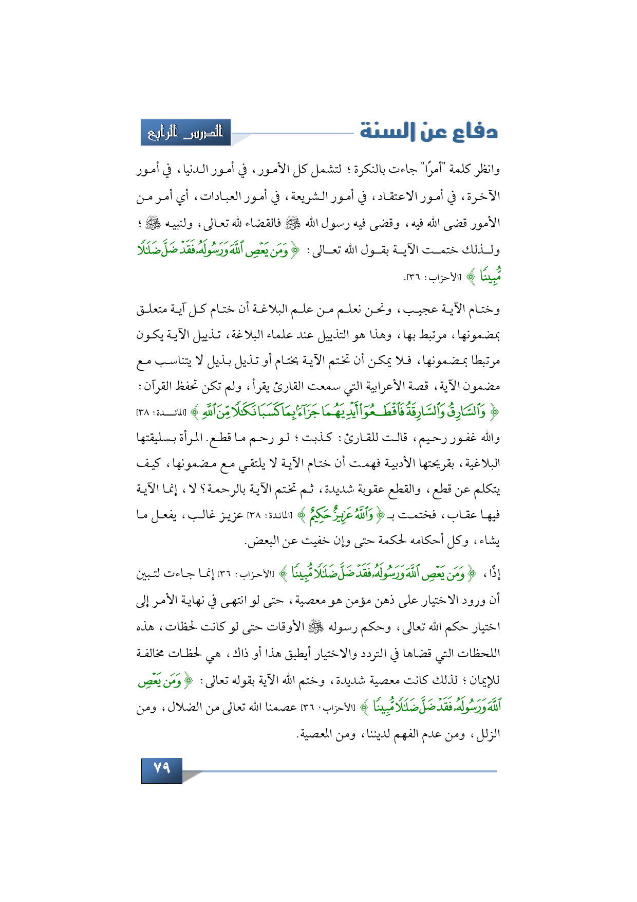 وختام الآية عجيب، ونحن نعلم من علم البلاغة أن ختام كل آية متعلق بمضمونها، مرتبط بها، وهذا هو التذييل عند علماء البلاغة، تذييل الآية يكون مرتبطا بمضمونها، فلا يمكن أن تختم الآية بختام أو تذيل بذيل لا يتناسب مع مضمون الآية، قصة الأعرابية التي سمعت القارئ يقرأ، ولم تكن تحفظ القرآن: {وَالسَّارِقُ وَالسَّارِقَةُ فَاقْطَعُوا أَيْدِيَهُمَا جَزَاءً بِمَا كَسَبَا نَكَالًا مِنَ اللَّهِ} (المائدة: 38) والله غفور رحيم، قالت للقارئ: كذبت؛ لو رحم ما قطع. المرأة بسليقتها البلاغية، بقريحتها الأدبية فهمت أن ختام الآية لا يلتقي مع مضمونها، كيف يتكلم عن قطع، والقطع عقوبة شديدة، ثم تختم الآية بالرحمة؟ لا، إنما الآية فيها عقاب، فختمت ب ـ {وَاللَّهُ عَزِيزٌ حَكِيمٌ} (المائدة: 38)، عزيز غالب، يفعل ما يشاء، وكل أحكامه لحكمة حتى وإن خفيت عن البعض.