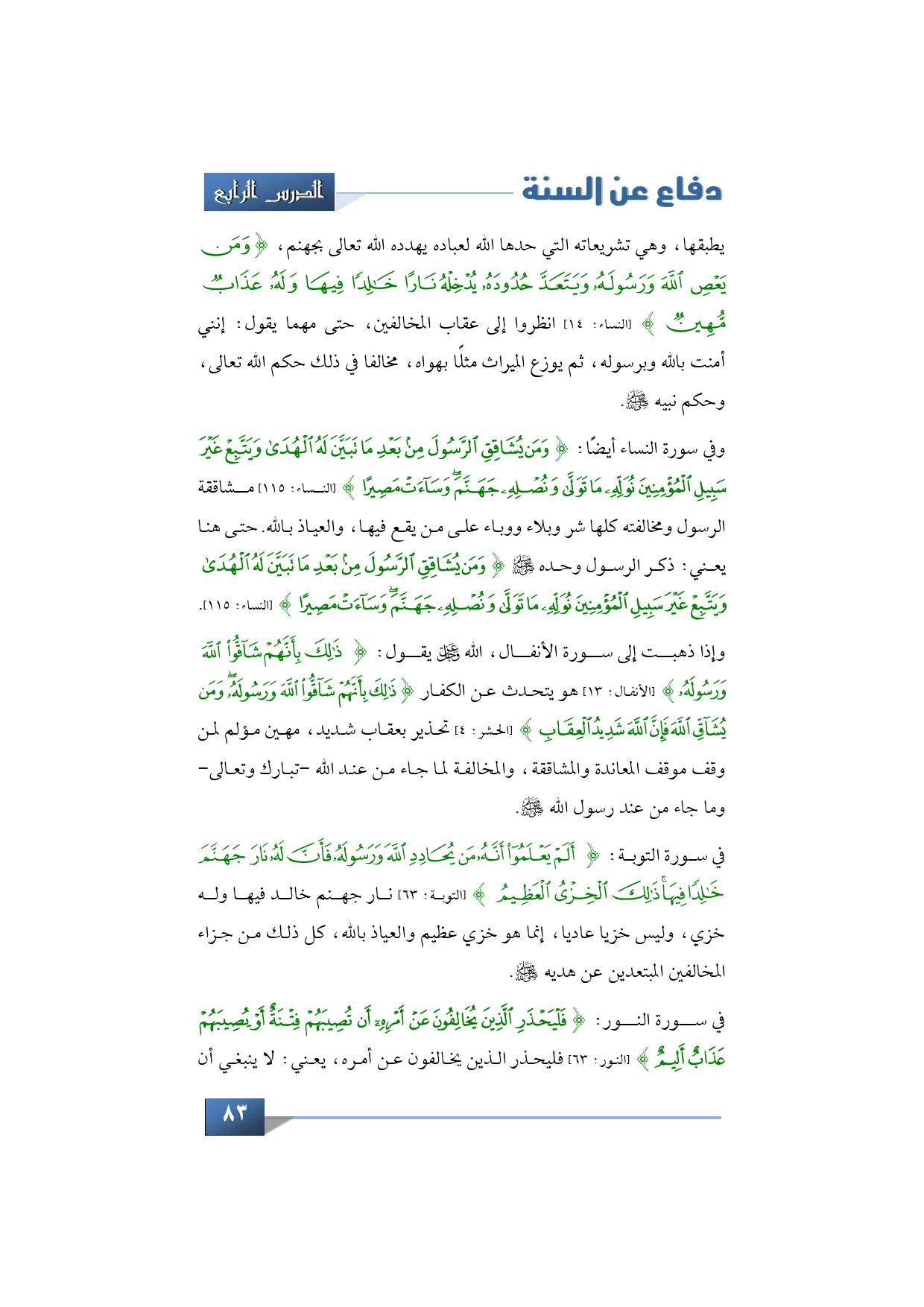 وفي سورة النساء أيضًا: {وَمَنْ يُشَاقِقِ الرَّسُولَ مِنْ بَعْدِ مَا تَبَيَّنَ لَهُ الْهُدَى وَيَتَّبِعْ غَيْرَ سَبِيلِ الْمُؤْمِنِينَ نُوَلِّهِ مَا تَوَلَّى وَنُصْلِهِ جَهَنَّمَ وَسَاءَتْ مَصِيرًا} (النساء: 115)، مشاققة الرسول ومخالفته كلها شر بلاء ووباء على من يقع فيها، والعياذ بالله. حتى هنا يعني: ذكر الرسول وحده -صلى الله عليه وسلم- {وَمَنْ يُشَاقِقِ الرَّسُولَ مِنْ بَعْدِ مَا تَبَيَّنَ لَهُ الْهُدَى وَيَتَّبِعْ غَيْرَ سَبِيلِ الْمُؤْمِنِينَ نُوَلِّهِ مَا تَوَلَّى وَنُصْلِهِ جَهَنَّمَ وَسَاءَتْ مَصِيرًا} (النساء: 115).