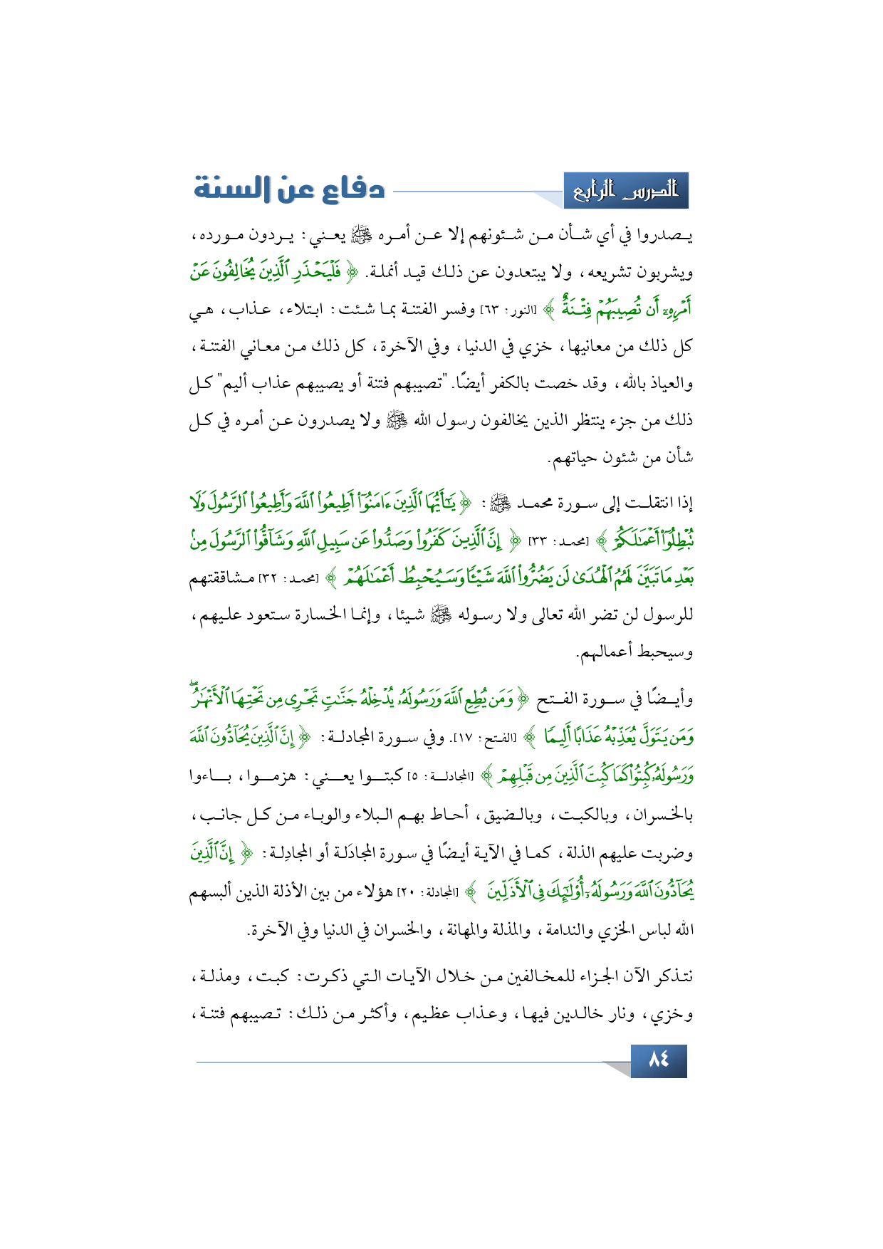 وأيضًا في سورة الفتح {وَمَنْ يُطِعِ اللَّهَ وَرَسُولَهُ يُدْخِلْهُ جَنَّاتٍ تَجْرِي مِنْ تَحْتِهَا الْأَنْهَارُ وَمَنْ يَتَوَلَّ يُعَذِّبْهُ عَذَابًا أَلِيمًا} (الفتح: 17). وفي سورة المجادلة: {إِنَّ الَّذِينَ يُحَادُّونَ اللَّهَ وَرَسُولَهُ كُبِتُوا كَمَا كُبِتَ الَّذِينَ مِنْ قَبْلِهِمْ} (المجادلة: 5)، كبتوا يعني: هزموا، باءوا بالخسران، وبالكبت، وبالضيق، أحاط بهم البلاء والوباء من كل جانب، وضربت عليهم الذلة، كما في الآية أيضًا في سورة المجادَلة أو المجادِلة: {إِنَّ الَّذِينَ يُحَادُّونَ اللَّهَ وَرَسُولَهُ أُولَئِكَ فِي الْأَذَلِّينَ} (المجادلة: 20) هؤلاء من بين الأذلة الذين ألبسهم الله لباس الخزي والندامة، والمذلة والمهانة، والخسران في الدنيا وفي الآخرة.