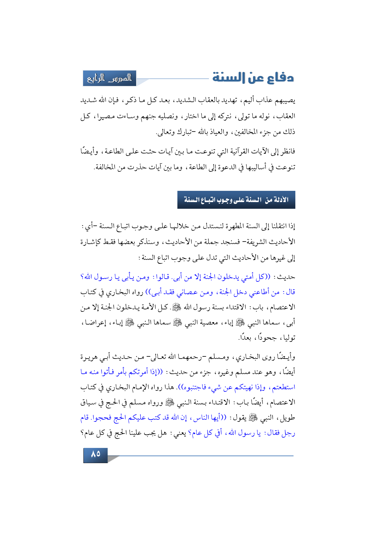 في الحديث عند البخاري: ((كل أمتي يدخلون الجنة إلا من أبى. قالوا: ومن يأبى يا رسول الله؟ قال: من أطاعني دخل الجنة، ومن عصاني فقد أبى))، هذا حديث رواه البخاري في كتاب الاعتصام، باب: الاقتداء بسنة رسول الله -صلى الله عليه وسلم-. كل الأمة يدخلون الجنة إلا من أبى، سماها النبي -صلى الله عليه وسلم- إباء، معصية النبي -صلى الله عليه وسلم- سماها النبي -صلى الله عليه وسلم- إباء، إعراضا، توليا، جحودًا، بعدًا.