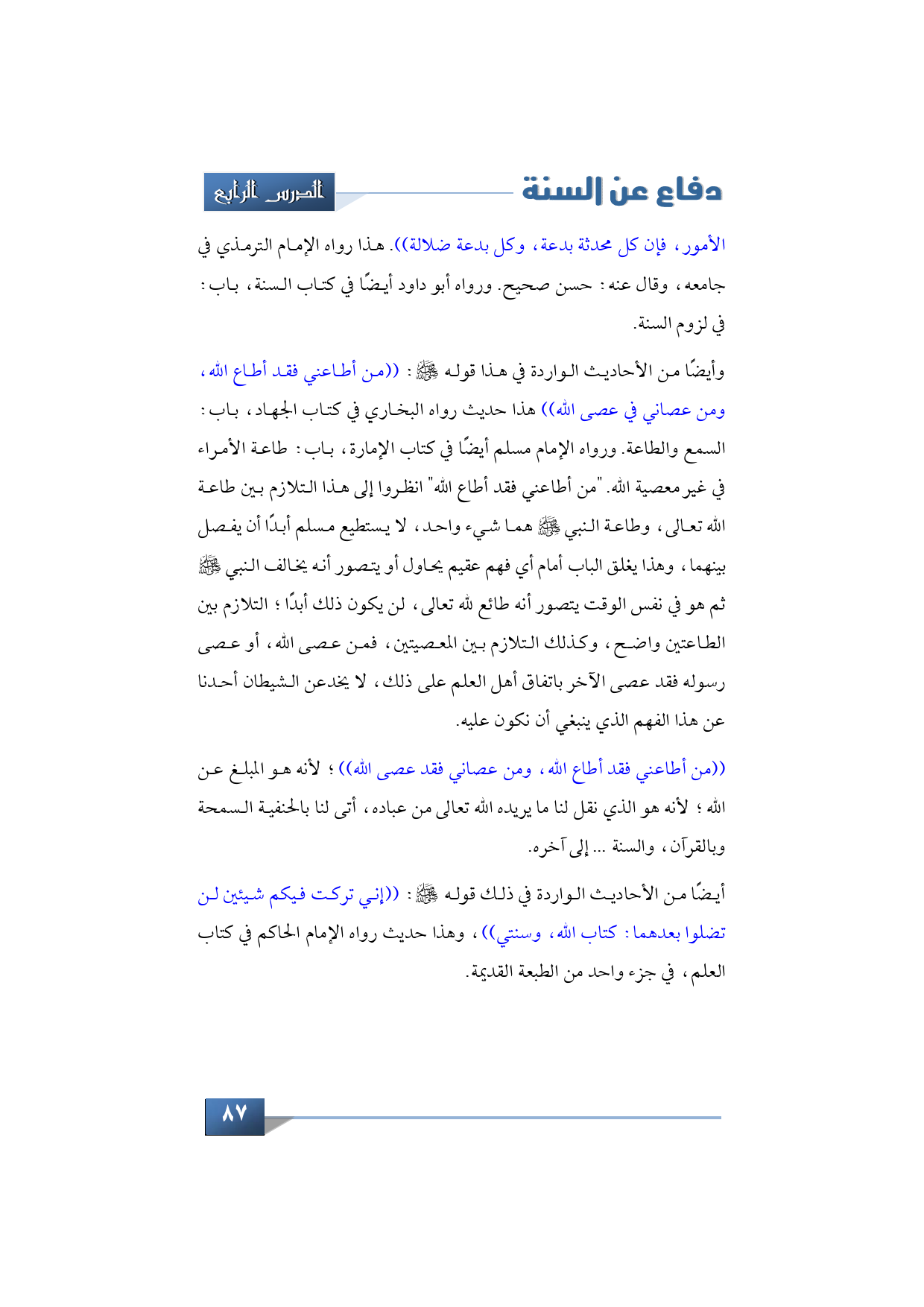 أيضًا من الأحاديث الواردة في ذلك قوله -صلى الله عليه وسلم-: ((إني تركت فيكم شيئين لن تضلوا بعدهما: كتاب الله، وسنتي))، وهذا حديث رواه الإمام الحاكم في كتاب العلم، في جزء واحد من الطبعة القديمة في ص 93.
