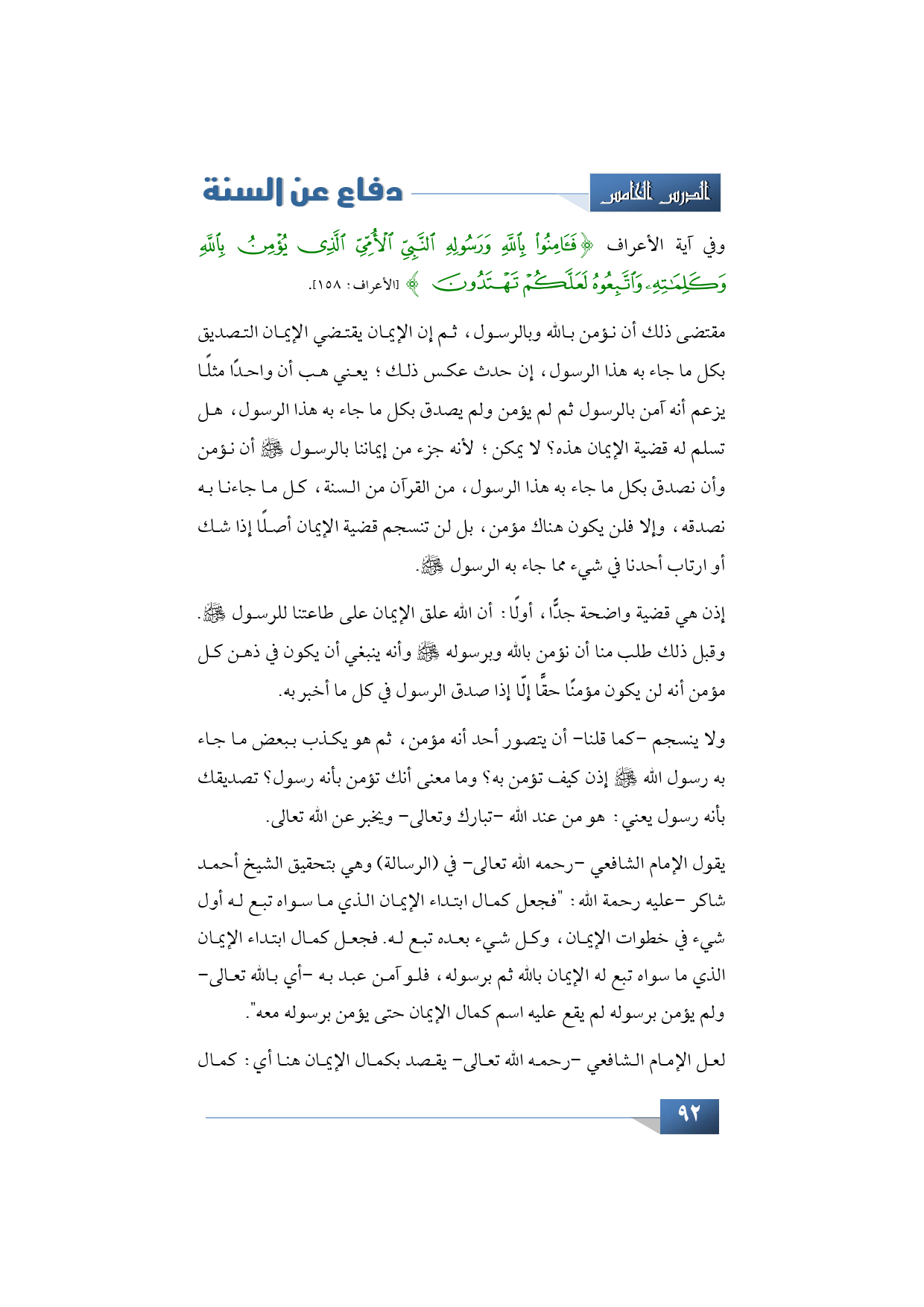 يقول الإمام الشافعي -رحمه الله تعالى- في (الرسالة) وهي بتحقيق الشيخ أحمد شاكر -عليه رحمة الله- وقد رقم فقراتها، في الفقرة 239 وما بعدها يقول الإمام الشافعي -رحمه الله-: "فجعل كمال ابتداء الإيمان الذي ما سواه تبع له أول شيء في خطوات الإيمان، وكل شيء بعده تبع له. فجعل كمال ابتداء الإيمان الذي ما سواه تبع له الإيمان بالله ثم برسوله، فلو آمن عبد به -أي بالله تعالى- ولم يؤمن برسوله لم يقع عليه اسم كمال الإيمان حتى يؤمن برسوله معه".