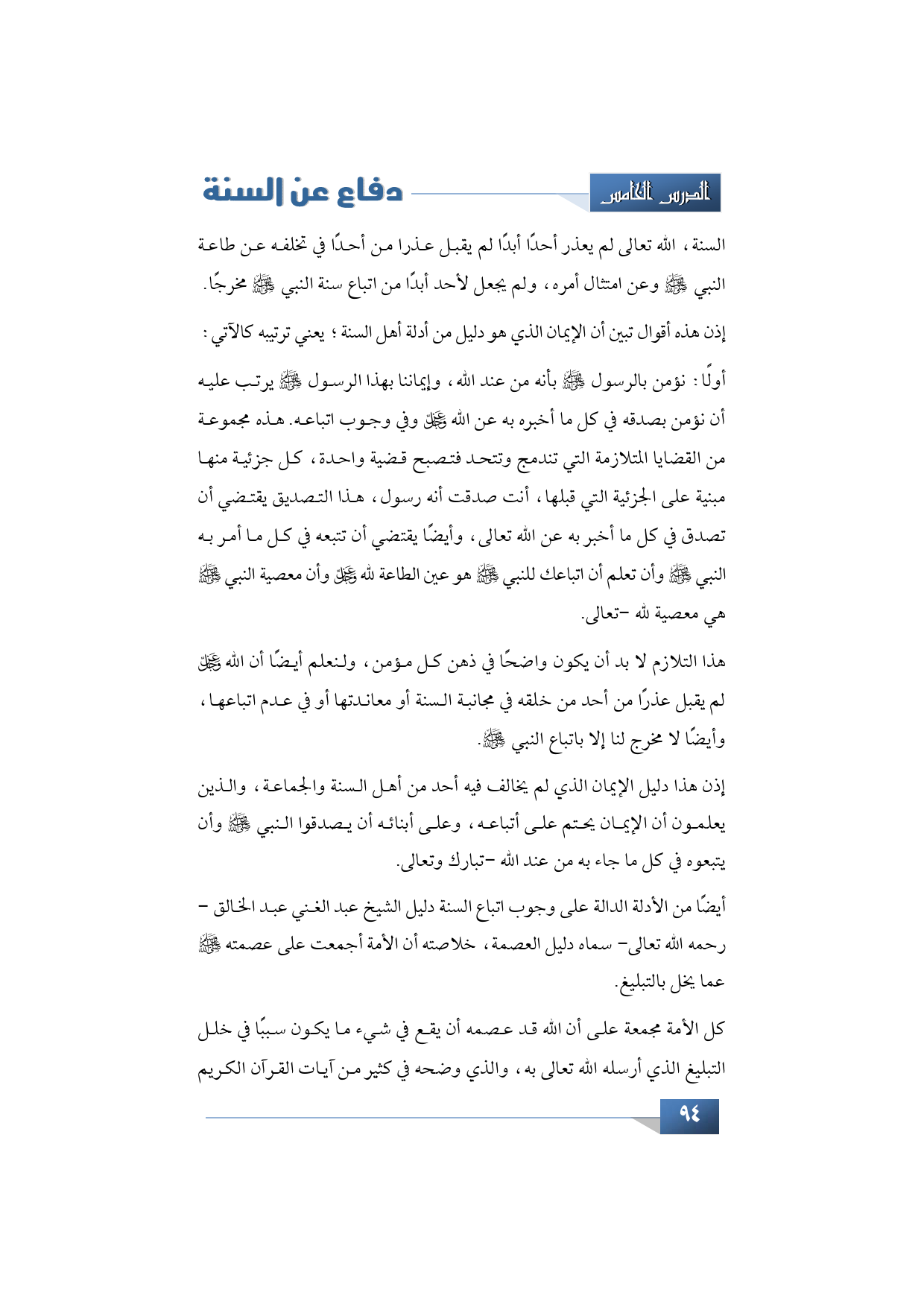إذن هذا دليل الإيمان الذي لم يخالف فيه أحد من أهل السنة والجماعة، والذين يعلمون أن الإيمان يحتم على أتباعه، وعلى أبنائه أن يصدقوا النبي -صلى الله عليه وسل م- وأن يتبعوه في كل ما جاء به من عند الله -تبارك وتعالى-.