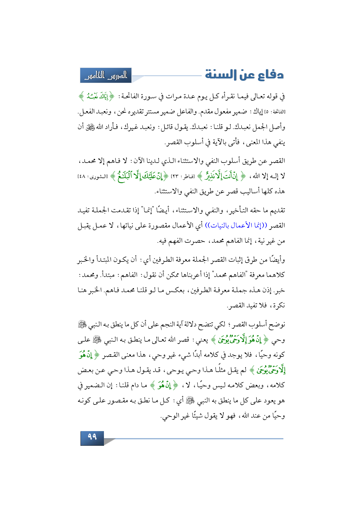 أنا لا أشرح أسلوب القصر لأنه في مادة البلاغة موضوع يدرس، إنما أنا الآن أوضح وأقرب المعنى لكي تتضح دلالة آية النجم على أن كل ما ينطق به النبي -صلى الله عليه وسل م- وحي {إِنْ هُوَ إِلَّا وَحْيٌ} يعني: قصر الله تعالى ما ينطق به النبي -صلى الله عليه وسل م- على كونه وحيًا، فلا يوجد في كلامه أبدًا شيء غير وحي، هذا معنى القصر {إِنْ هُوَ إِلَّا وَحْيٌ يُوحَى} لم يقل مثلًا هذا وحي يوحى، قد يقول هذا وحي عن بعض كلامه، وبعض كلامه ليس وحيًا، لا، {إِنْ هُوَ} ما دام قلنا إن الضمير في هو يعود على كل ما ينطق به النبي -صلى الله عليه وسل م- أي كل ما نطق به مقصور على كونه وحيًا من عند الله، فهو لا يقول شيئًا غير الوحي.