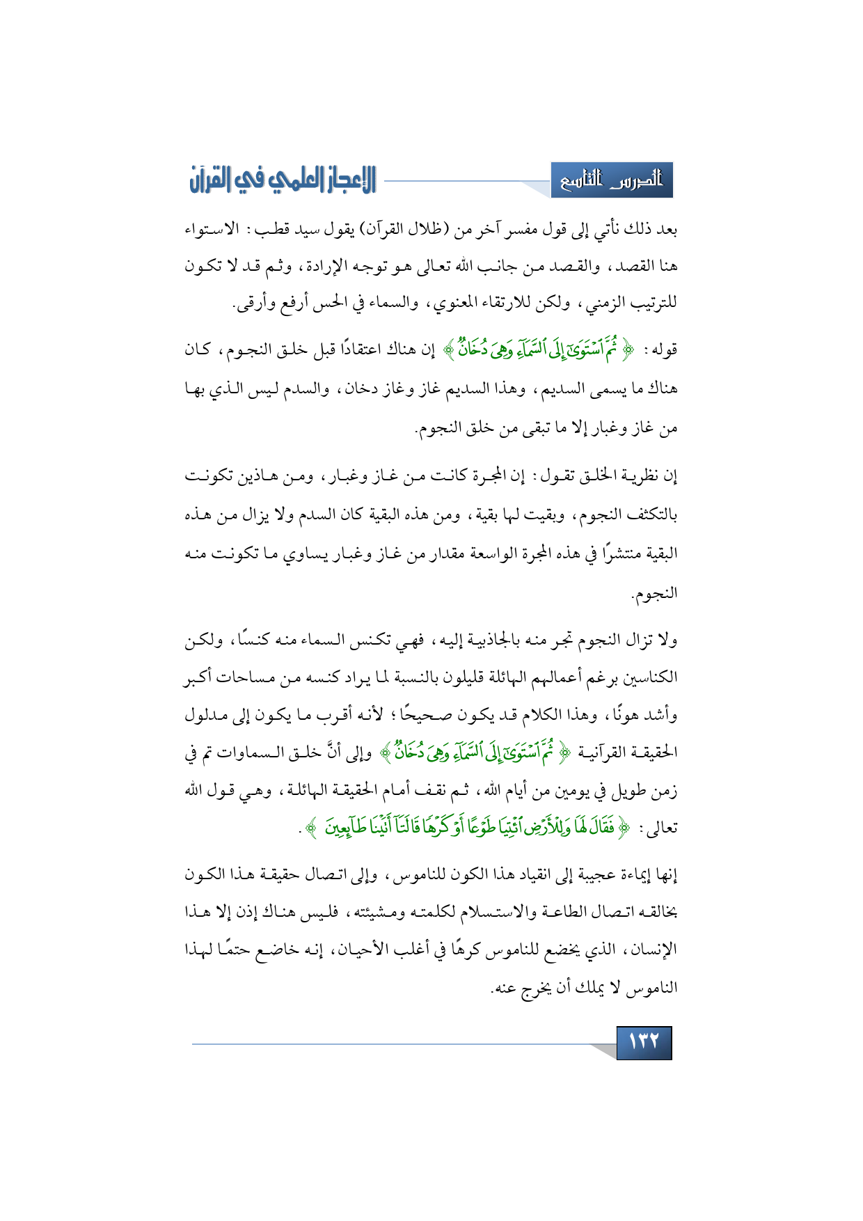 ولا تزال النجوم تجر منه بالجاذبية إليه، فهي تكنس السماء منه كنسًا، ولكن الكناسين برغم أعمالهم الهائلة قليلون بالنسبة لما يراد كنسه من مساحات أكبر وأشد هونًا، وهذا الكلام قد يكون صحيحًا؛ لأنه أقرب ما يكون إلى مدلول الحقيقة القرآنية {ثُمَّ اسْتَوَى إِلَى السَّمَاءِ وَهِيَ دُخَانٌ} وإلى أنَّ خلق السماوات تم في زمن طويل في يومين من أيام الله، ثم نقف أمام الحقيقة الهائلة، وهي قول الله تعالى: {فَقَالَ لَهَا وَلِلْأَرْضِ اِئْتِيَا طَوْعًا أَوْ كَرْهًا قَالَتَا أَتَيْنَا طَائِعِينَ}.