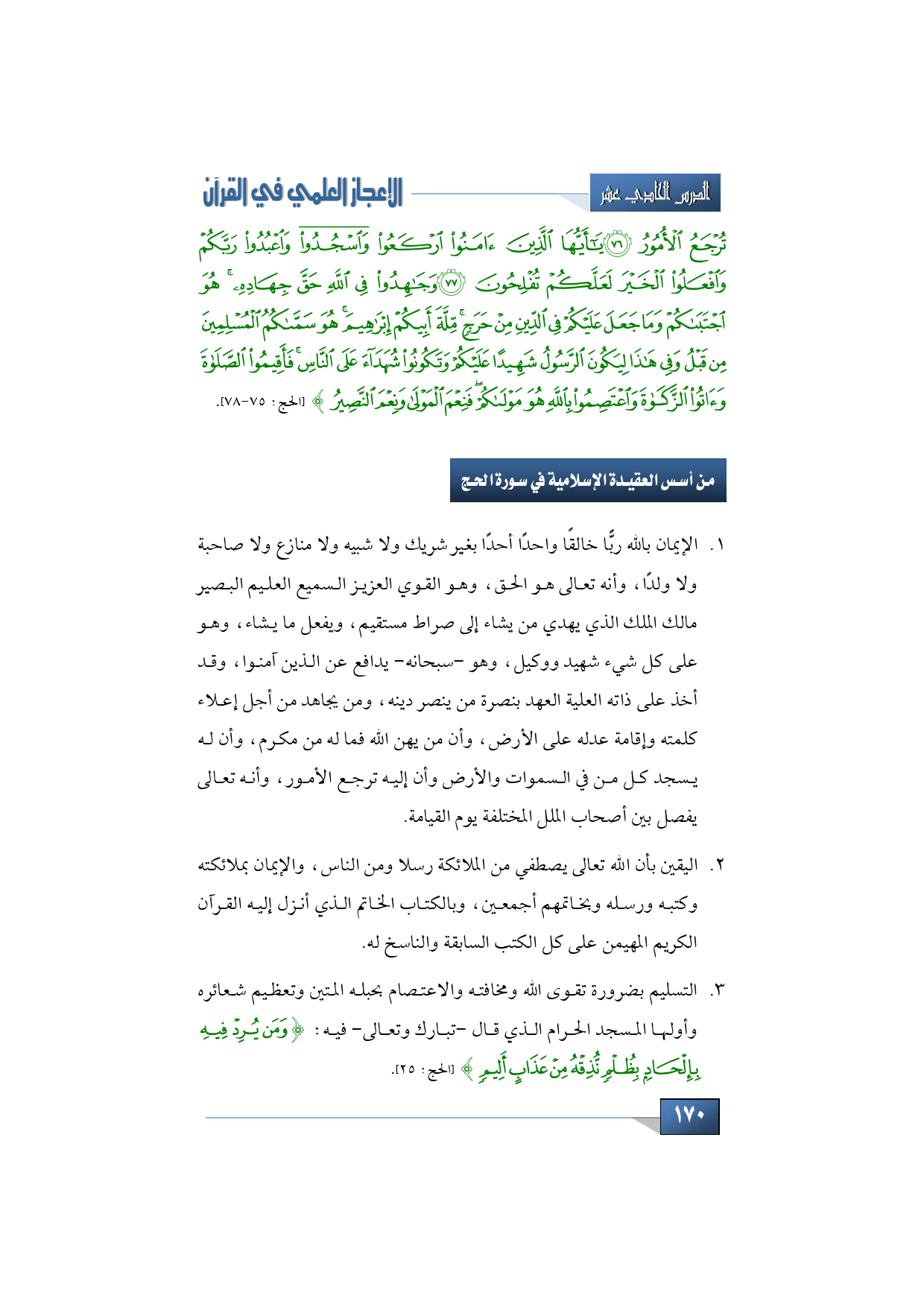 1 - الإيمان بالله رب ًّ اخالق ً اواحد ً اأحد ً ابغير شريك ولا شبيه ولا منازع ولا صاحب ة ولا ولد ًا، وأنه تعالى هو الحق، وهو القوي العزيز السميع العليم البصير مالك الملك الذي يهدي من يشاء إلى صراط مستقيم، ويفعل ما يشاء، وهو على كل شيء شهيد ووكيل، وهو - سبحانه - ي دافع عن الذين آمنوا، وقد أخذ على ذاته العلية العهد بنصرة من ينصر دينه، ومن يجاهد من أجل إعلاء كلمته وإقامة عدله على الأرض، وأن من يهن الله فما له من مكرم، وأن له يسجد كل من في السموات والأرض وأن إليه ترجع الأمور، وأنه تعالى يفصل بين أصحاب الملل المختلفة يوم القيامة.