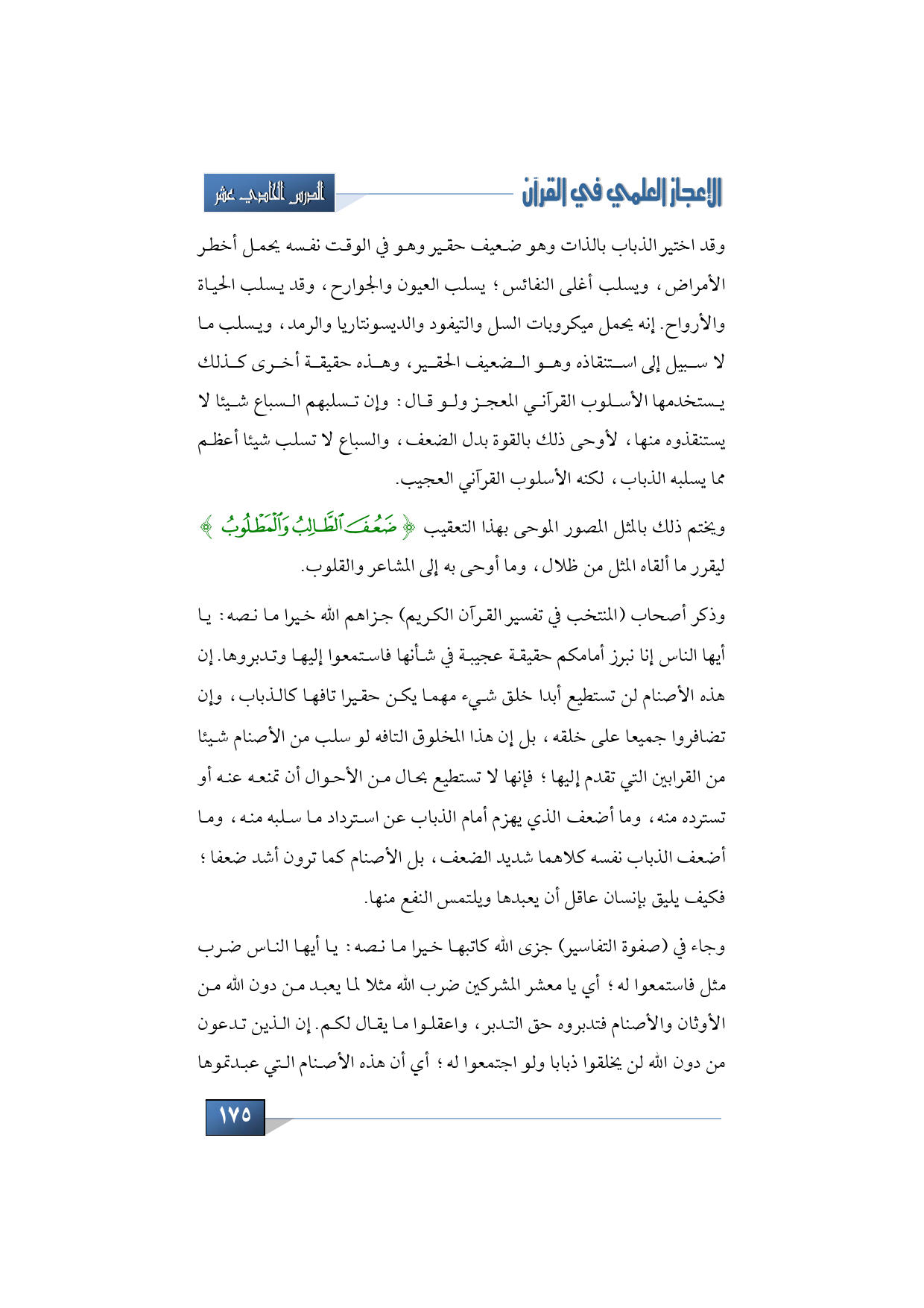 وقد اختير الذباب بالذات وهو ضعيف حقير وهو في الوقت نفسه يحمل أخطر الأمراض، ويسلب أغلى النفائس؛ يسلب العيون والجوارح، وقد يسلب الحياة والأرواح. إنه يحمل ميكروبات السل والتيفود والديسونتاريا والرمد، ويسلب ما لا سبيل إلى استنقاذه وهو الضعيف الحقير، وهذه حقيقة أخرى كذلك يستخدمها الأسلوب القرآني المعجز ولو قال: وإن تسلبهم السباع شيئا لا يستنقذوه منها، لأوحى ذلك بالقوة بدل الضعف، والسباع لا تسلب شيئا أعظم مما يسلبه الذباب، لكنه الأسلوب القرآني العجيب.