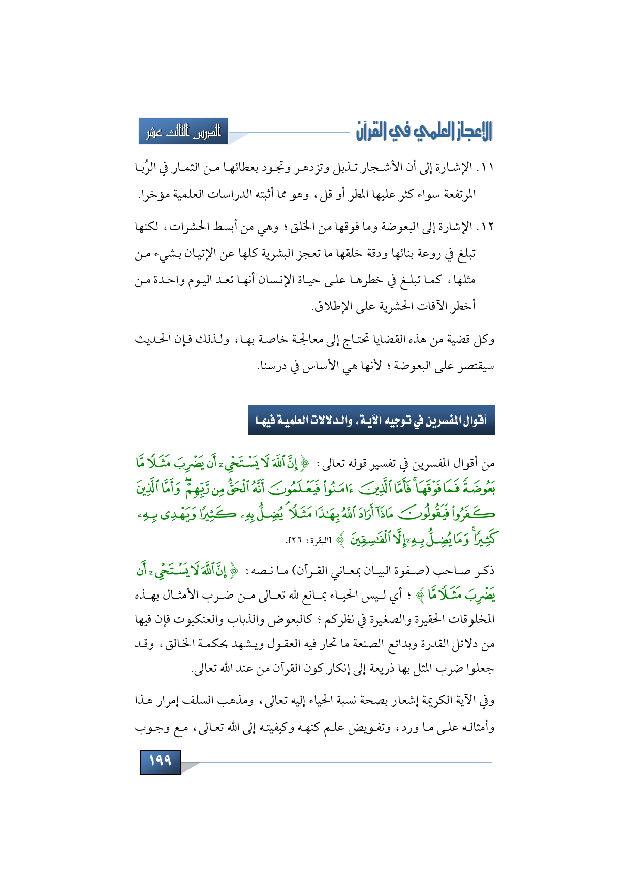 12 - الإشارة إلى البعوضة وما فوقها من الخلق؛ وهي من أبسط الحشرات، لكنها تبلغ في روعة بنائها ودقة خلقها ما تعجز البشرية كلها عن الإتيان بش يء من مثلها، كما تبلغ في خطرها على حياة الإنسان أنها تعد اليوم واحدة من أخطر الآفات الحشرية على الإطلاق.