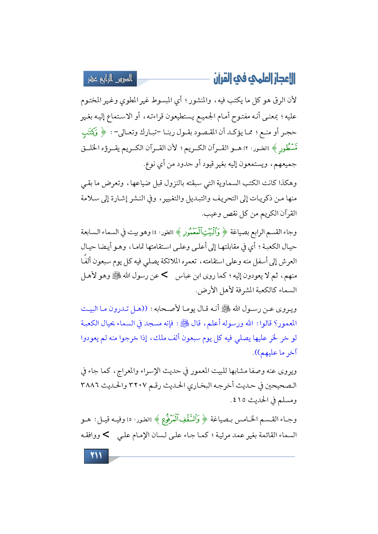 وجاء القسم الرابع بصياغة {وَالْبَيْتِ الْمَعْمُورِ} (الطور: 4) وهو بيت في السماء السابعة حيال الكعبة؛ أي في مقابلتها إلى أعل ى وعل ى استقامتها تماما، وهو أيضا حيال العرش إلى أسفل منه وعلى استقامته، تعمره الملائكة يصلي فيه كل يوم سبعون ألفًا منهم، ثم لا يعودون إليه؛ كما روى ابن عباس - رضي الله عنه - عن رسول الله -صلى الله عليه وسلم- وهو لأهل السماء كالكعبة المشرفة لأهل الأرض.