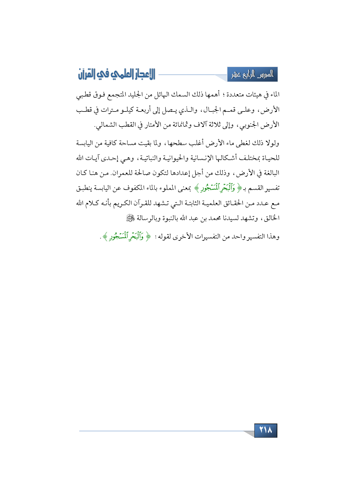 ولولا ذلك لغطى ماء الأرض أغلب سطحها، ولما بقيت مساحة كافية من اليابسة للحياة بمختلف أشكالها الإنسانية والحيوانية والنباتية، وهي إحدى آيات الله البالغة في الأرض، ووذلك من أجل إعدادها لتكون صالحة للعمران. من هنا كان تفسير القسم بـ {وَالْبَحْرِ الْمَسْجُورِ} بمعنى المملوء بالماء المكفوف عن اليابسة ينطبق مع عدد من الحقائق العلمية الثابتة التي تشهد للقرآن الكريم بأنه كلام الله الخالق، وتشهد لسيدنا محمد بن عبد الله بالنبوة وبالرسالة عليه أفضل الصلاة وأتم التسليم.