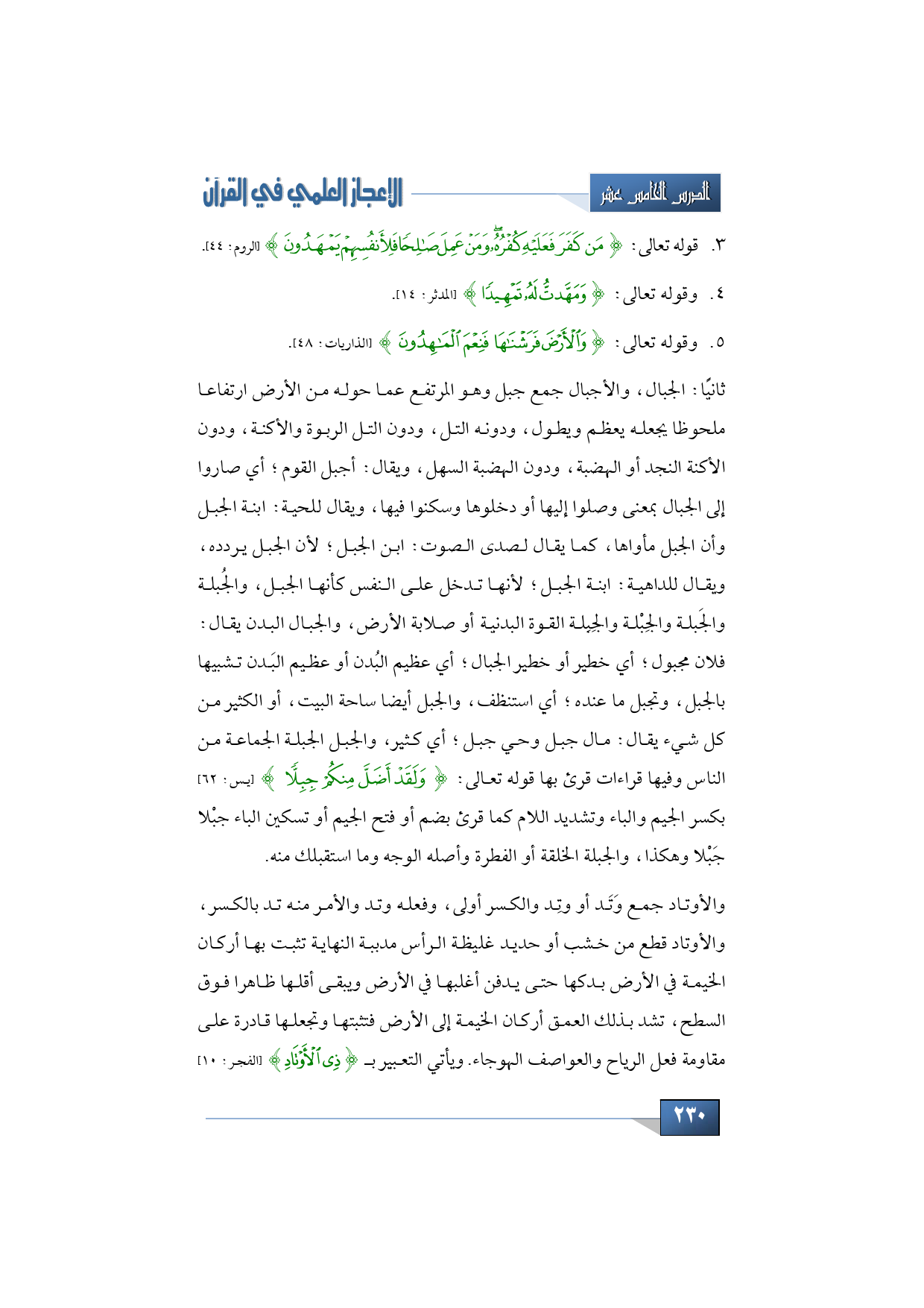 ثاني ً ا: الجبال، والأجبال جمع جبل وهو المرتفع عما حوله من الأرض ارتفاعا ملحوظا يجعله يعظم ويطول، ودونه التل، ودون التل الربوة والأك ن ة، ودون الأك ن ة النجد أو الهضبة، ودون الهضبة السهل، ويقال: أجبل القوم؛ أي صاروا إلى الجبال بمعنى وصلوا إليها أو دخلوها وسكنوا فيها، ويقال للحية: ابنة الجبل وأن الجبل مأواها، كما يقال لصدى الصوت: ابن الجبل؛ لأن الجبل يردده، ويقال للداهية: ابنة الجبل؛ لأنها تدخل على النفس كأنها الجبل، والجُبلة والجَبلة والجِب ْ لة والجِبِلة القوة البدنية أو صلابة الأرض، والجبال البدن يقال: فلان مجبول؛ أي خطير أو خ طير الجبال؛ أي عظيم البُدن أو عظيم الب َ دن تشبيها بالجبل، وتجبل ما عنده؛ أي استنظف، والجبل أيضا ساح ة البيت، أو الكثير من كل شيء يقال: مال جبل وحي جبل؛ أي كثير، والجبل الجبلة الجماعة من الناس وفيها قراءات قر ئ بها قوله تعالى: {وَلَقَدْ أَضَلَّ مِنْكُمْ جِبِلًّا} (يس: 62) بكسر الجيم والباء وتشديد اللام كما قرئ بضم أو فتح الجيم أو تسكين الباء جبْلا جَبْلا وهكذا، والجبلة الخلقة أو الفطرة وأصله الوجه وما استقبلك منه.