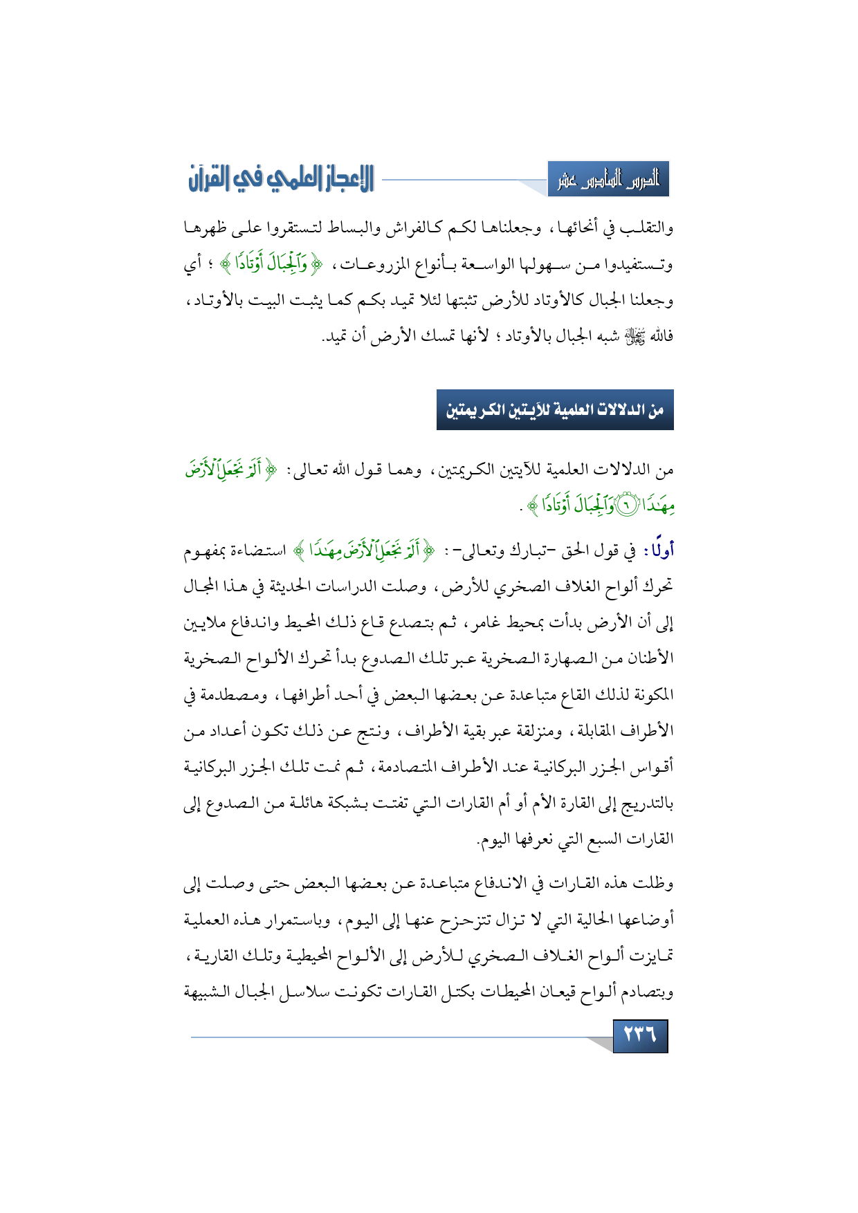 والتقلب في أنحائها وجعلنا الجبال أوتادا للأرض تثبتها، وفي تعليق هامش أضافوا ما نصه: يبلغ سمك الجزء الصلب من القشرة الأرضية نحو 60 كيلو متر ً ا، وتكثر فيه التجاعيد فيرتفع حيث الجبال وينخفض ليكون بطون البحار وقيعان المحيطات، وهو في حالة من التوازن بسبب الضغوط الناتجة من الجبال، ولا يختل هذا التوازن إلا بعوامل التعرية فقشرة الأرض اليابسة ترسيها الجبال كما ترسي الأوتاد الخيم ة.