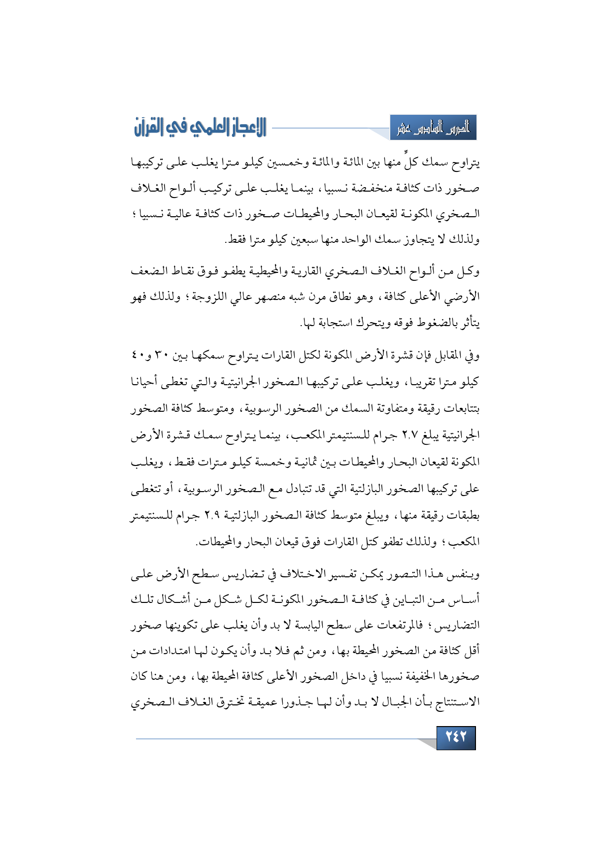 وفي المقابل فإن قشرة الأرض المكونة لكتل القارات يتراوح سمكها بين 30 و40 كيلو مترا تقريبا، ويغلب على تركيبها الصخور الجرانيتية والتي تغطى أحيانا بتتابعات رقيقة ومتفاوتة السمك من الصخور الرسوبية، ومتوسط كثافة الصخور الجرانيتية يبلغ 2.7 جرام للسنتيمتر المكعب، بينما يتراوح سمك قشرة الأرض المكونة لقيعان البحار والمحيطات بين ثمانية وخمسة كيلو مترات فقط، ويغلب على تركيبها الصخور البازلتية التي قد تتبادل مع الصخور الرسوبية، أو تتغطى بطبقات رقيقة منها، ويبلغ متوسط كثافة الصخور البازلتية 2.9 جرام للسنتيمتر المكعب؛ ولذلك تطفو كتل القارات فوق قيعان البحار والمحيطات.