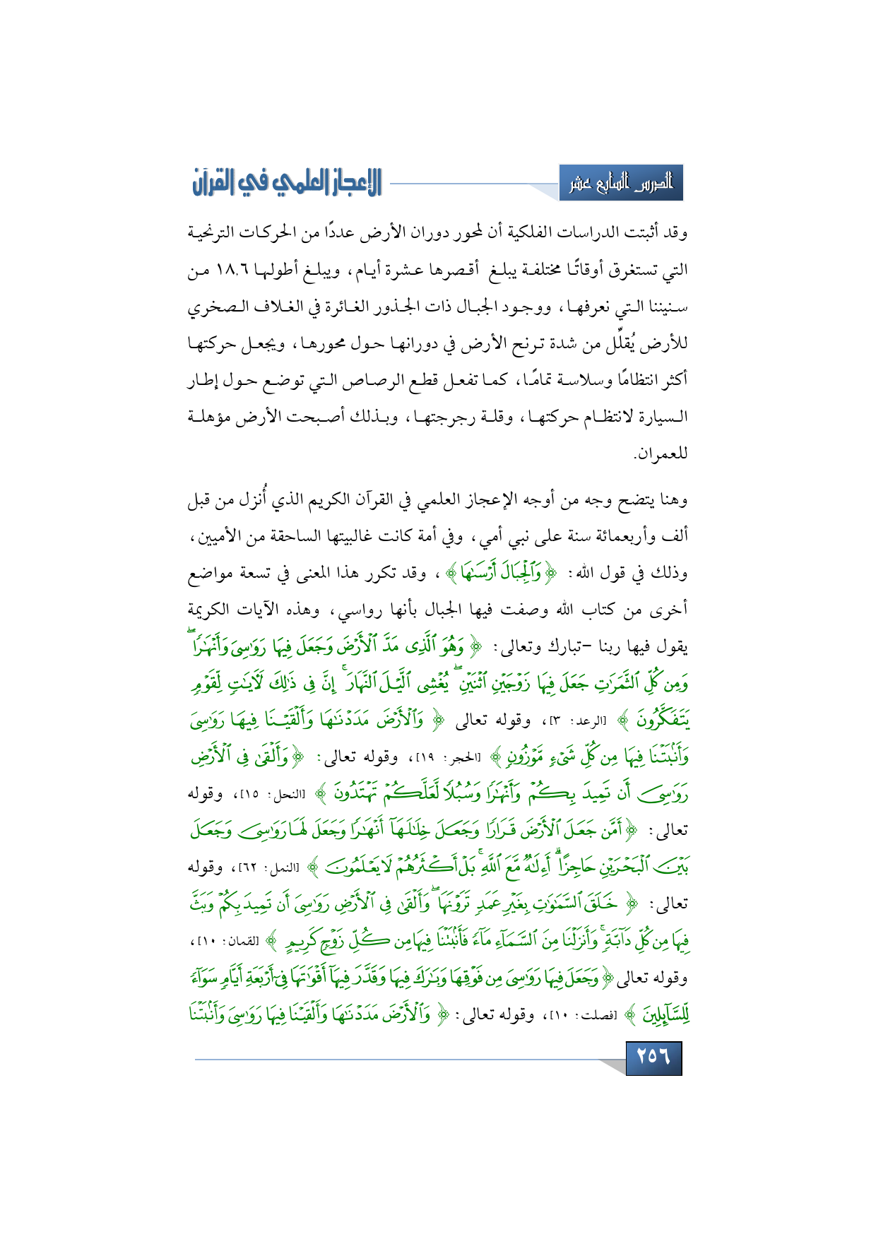 وهنا يتضح وجه من أوجه الإعجاز العلمي في القرآن الكريم الذي أُنزل من قبل ألف وأربعمائة سنة على نبي أمي، وفي أمة كانت غالبيتها الساحقة من الأميين، وذلك في قول الله: {وَالْجِبَالَ أَرْسَاهَا}، وقد تكرر هذا المعنى في تسعة مواضع أخرى من كتاب الله وصفت فيها الجبال بأنها رواسي، وهذه الآيات الكريمة يقول فيها ربنا - تبارك وتعالى: {وَهُوَ الَّذِي مَدَّ الْأَرْضَ وَجَعَلَ فِيهَا رَوَاسِيَ وَأَنْهَارًا وَمِنْ كُلِّ الثَّمَرَاتِ جَعَلَ فِيهَا زَوْجَيْنِ اثْنَيْنِ يُغْشِي اللَّيْلَ النَّهَارَ إِنَّ فِي ذَلِكَ لَآيَاتٍ لِقَوْمٍ يَتَفَكَّرُونَ} (الرعد: 3)، وقوله تعالى {وَالْأَرْضَ مَدَدْنَاهَا وَأَلْقَيْنَا فِيهَا رَوَاسِيَ وَأَنْبَتْنَا فِيهَا مِنْ كُلِّ شَيْءٍ مَوْزُونٍ} (الحجر: 19)، وقوله تعالى: {وَأَلْقَى فِي الْأَرْضِ رَوَاسِيَ أَنْ تَمِيدَ بِكُمْ وَأَنْهَارًا وَسُبُلًا لَعَلَّكُمْ تَهْتَدُونَ} (النحل: 15)، وقوله تعالى: {أَمَّنْ جَعَلَ الْأَرْضَ قَرَارًا وَجَعَلَ خِلَالَهَا أَنْهَارًا وَجَعَلَ لَهَا رَوَاسِيَ وَجَعَلَ بَيْنَ الْبَحْرَيْنِ حَاجِزًا أَإِلَهٌ مَعَ اللَّهِ بَلْ أَكْثَرُهُمْ لَا يَعْلَمُونَ} (النمل: 62)، وقوله تعال ى: {خَلَقَ السَّمَاوَاتِ بِغَيْرِ عَمَدٍ تَرَوْنَهَا وَأَلْقَى فِي الْأَرْضِ رَوَاسِيَ أَنْ تَمِيدَ بِكُمْ وَبَثَّ فِيهَا مِنْ كُلِّ دَابَّةٍ وَأَنْزَلْنَا مِنَ السَّمَاءِ مَاءً فَأَنْبَتْنَا فِيهَا مِنْ كُلِّ زَوْجٍ كَرِيمٍ} (لقمان: 10)، وقوله تعالى {وَجَعَلَ فِيهَا رَوَاسِيَ مِنْ فَوْقِهَا وَبَارَكَ فِيهَا وَقَدَّرَ فِيهَا أَقْوَاتَهَا فِي أَرْبَعَةِ أَيَّامٍ سَوَاءً لِلسَّائِلِينَ} (فصلت: 10)، وقوله تعال ى: {وَالْأَرْضَ مَدَدْنَاهَا وَأَلْقَيْنَا فِيهَا رَوَاسِيَ وَأَنْبَتْنَا