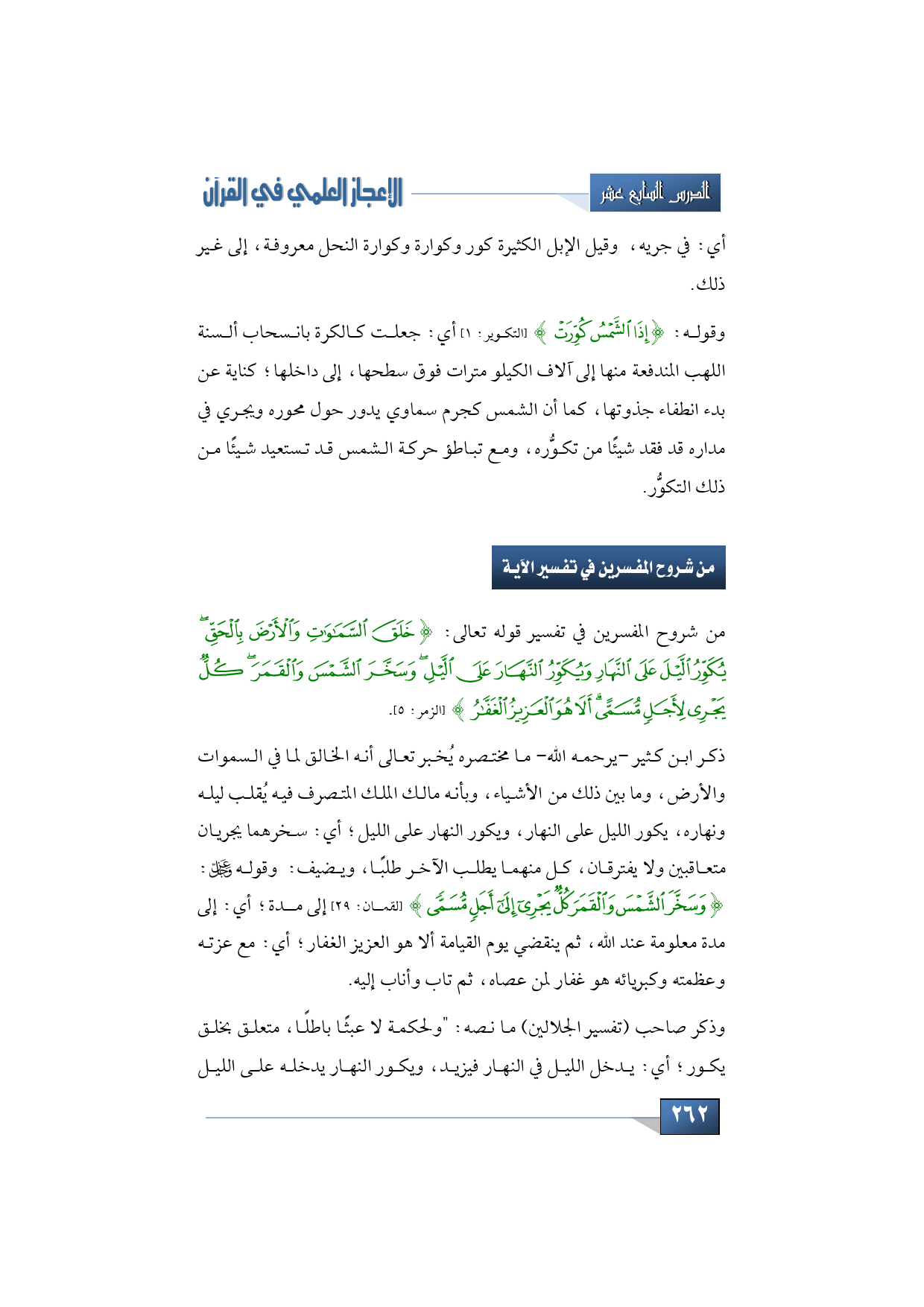من شروح المفسرين في تفسير قوله تعالى {خَلَقَ السَّمَاوَاتِ وَالْأَرْضَ بِالْحَقِّ يُكَوِّرُ اللَّيْلَ عَلَى النَّهَارِ وَيُكَوِّرُ النَّهَارَ عَلَى اللَّيْلِ وَسَخَّرَ الشَّمْسَ وَالْقَمَرَ كُلٌّ يَجْرِي لِأَجَلٍ مُسَمًّى أَلَا هُوَ الْعَزِيزُ الْغَفَّارُ} (الزمر: 5).