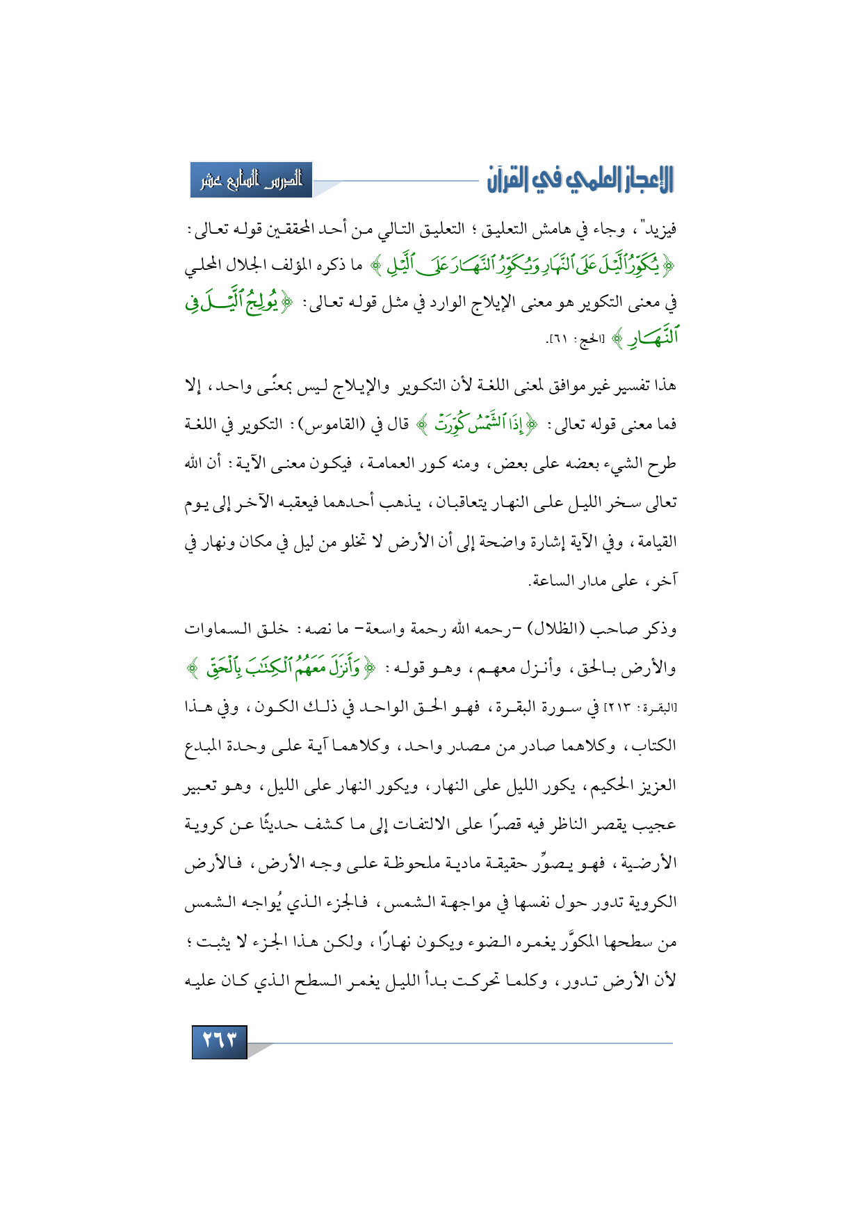 فيزيد"، وجاء في هامش التعليق؛ التعليق التالي من أحد المحققين قوله تعالى: {يكَوِّرُ اللَّيْلَ عَلَى النَّهَارِ وَيُكَوِّرُ النَّهَارَ عَلَى اللَّيْلِ} ما ذكره المؤلف الجلال المحلي في معنى التكوير هو معنى الإيلاج الوارد في مثل قوله تعالى: {يُولِجُ اللَّيْلَ فِي النَّهَارِ} (الحج: 61).
