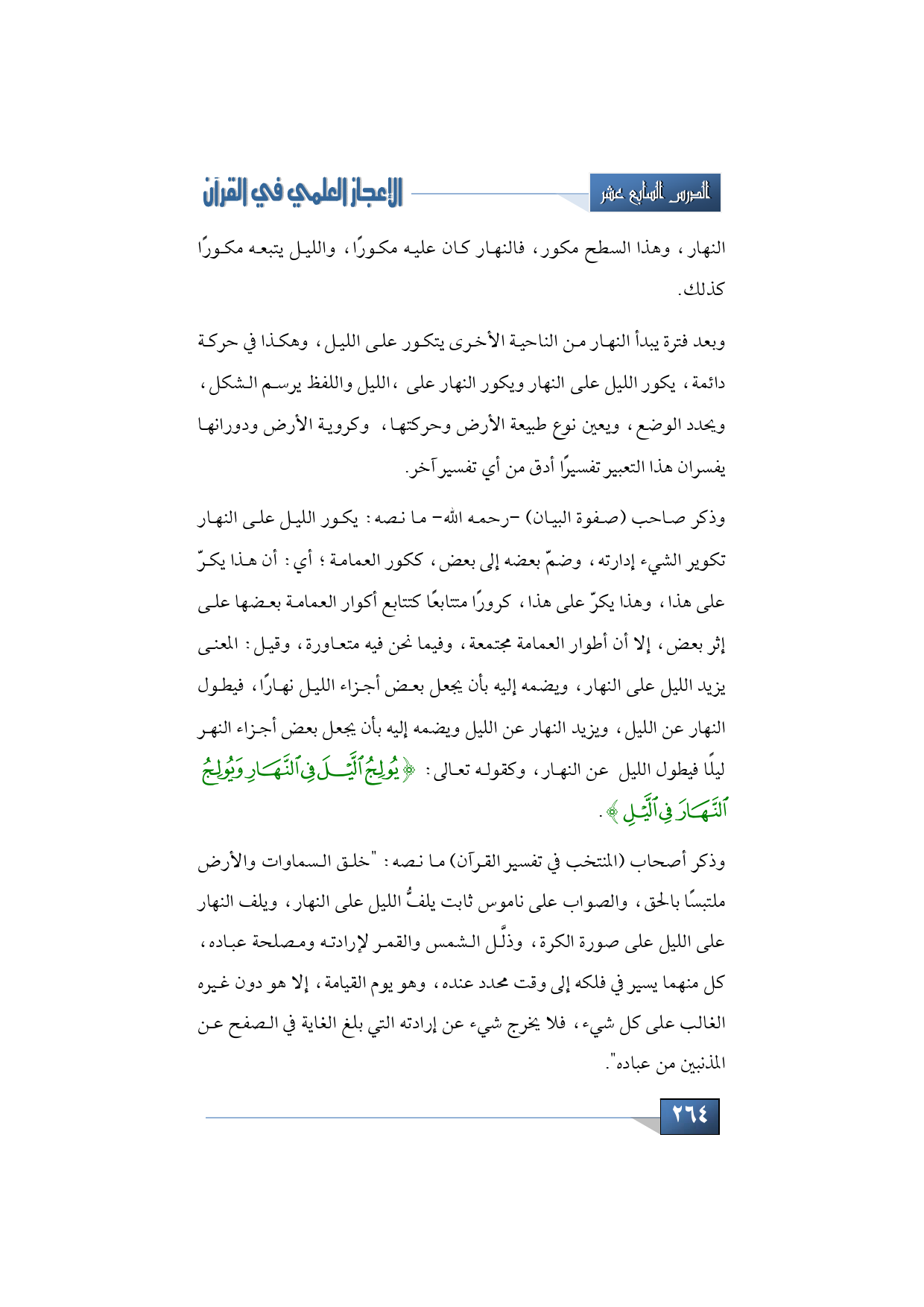 وبعد فترة يبدأ النهار من الناحية الأخرى يتكور على الليل، وهكذا في حركة دائمة، يكور الليل على النهار ويكور النهار على، الليل واللفظ يرسم الشكل، ويحدد الوضع، ويعين نوع طبيعة الأرض وحركتها، وكروية الأرض ودورانها يفسران هذا التعبير تفسيرًا أدق من أي تفسير آخر.