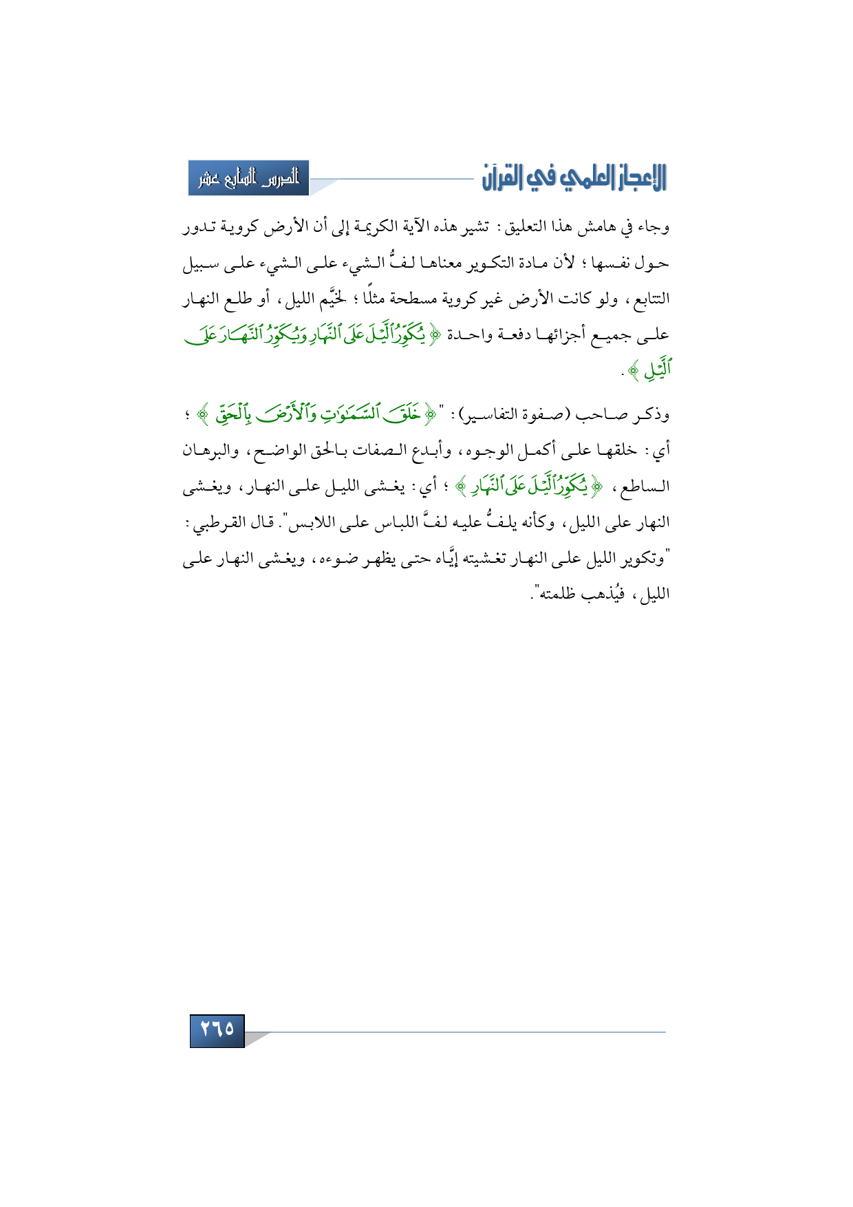 وجاء في هامش هذا التعليق: تشير هذه الآية الكريمة إلى أن الأرض كروية تدور حول نفسها؛ لأن مادة التكوير معناها لفُّ الشيء على الشيء على سبيل التتابع، ولو كانت الأرض غير كروية مسطحة مثلًا؛ لخيَّم الليل، أو طلع النهار على جميع أجزائها دفعة واحدة {يُكَوِّرُ اللَّيْلَ عَلَى النَّهَارِ وَيُكَوِّرُ النَّهَارَ عَلَى اللَّيْلِ}.