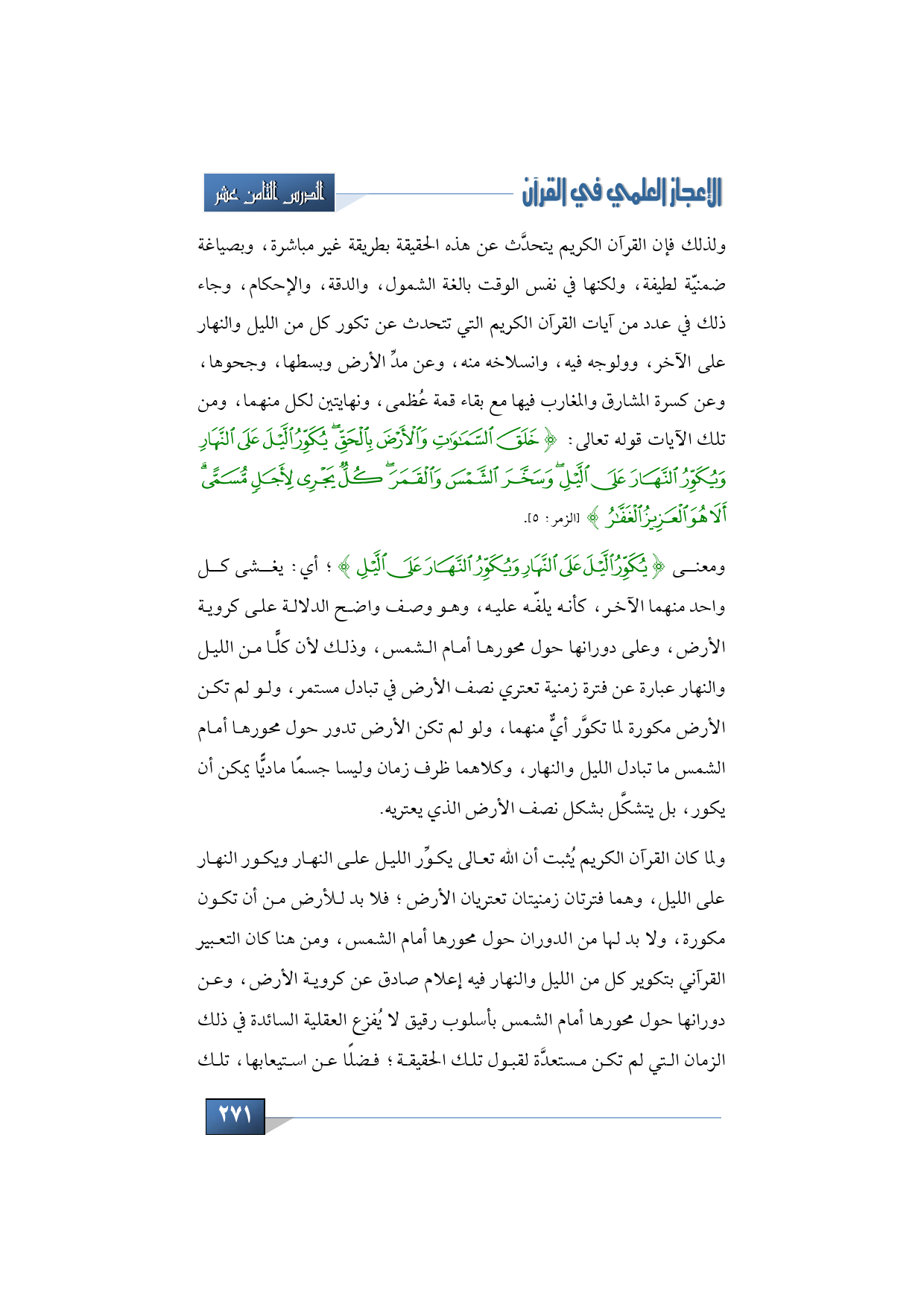 ولما كان القرآن الكريم يُثبت أن الله تعالى يكوِّر الليل على النهار ويكور النهار على الليل، وهما فترتان زمنيتان تعتريان الأرض؛ فلا بد للأرض من أن تكون مكورة، ولا بد لها من الدوران حول محورها أمام الشمس، ومن هنا كان التعبير القرآني بتكوير كل من الليل والنهار فيه إعلام صادق عن كروية الأرض، وعن دورانها حول محورها أمام الشمس بأسلوب رقيق لا يُفزع العقلية السائدة في ذلك الزمان التي لم تكن مستعدَّة لقبول تلك الحقيقة؛ فضلًا عن استيعابها، تلك