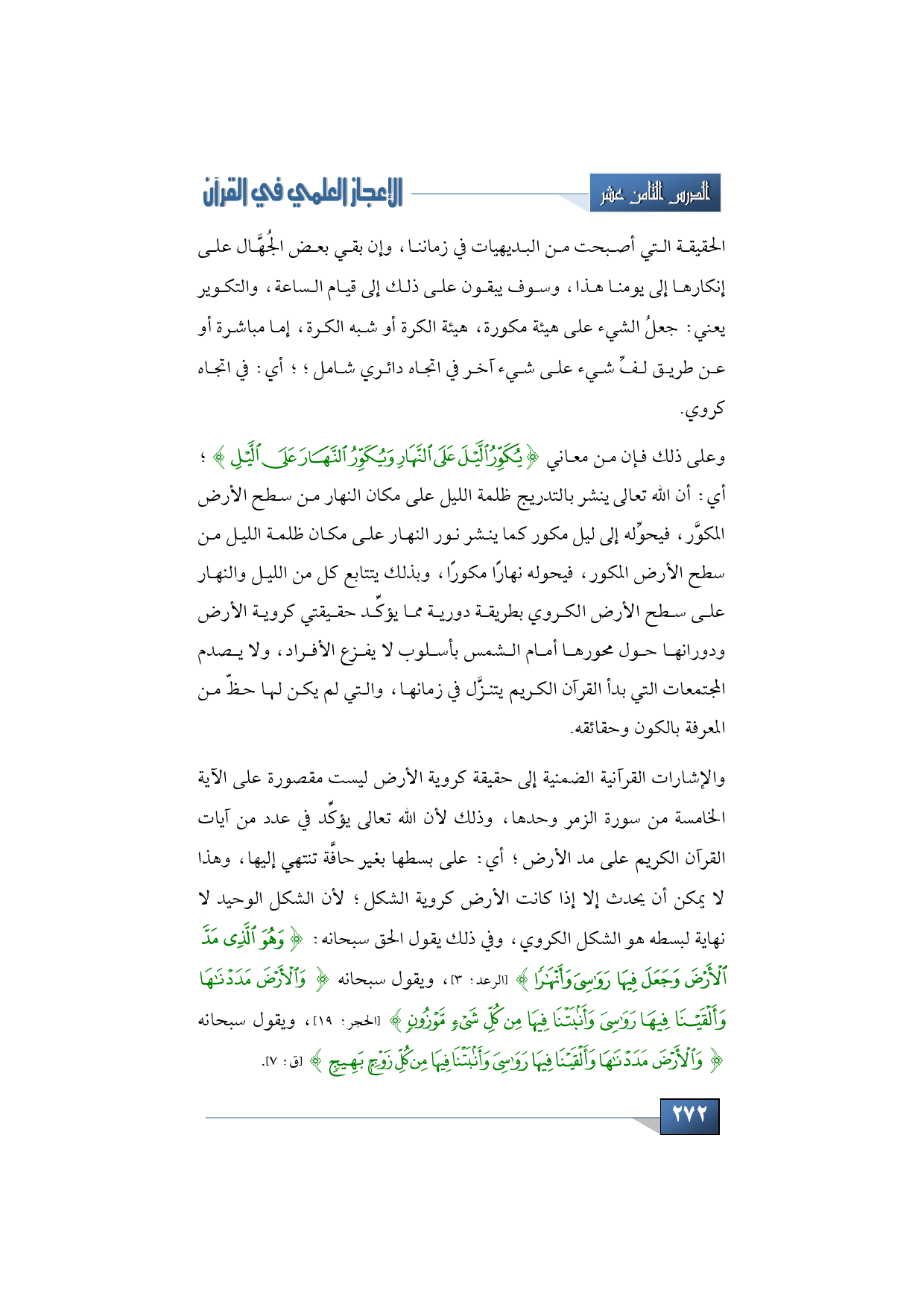 الحقيقة التي أصبحت من البديهيات في زماننا، وإن بقي بعض الجُهَّال على إنكارها إلى يومنا هذا، وسوف يبقون على ذلك إلى قيام الساعة، والتكوير يعني: جعلُ الشيء على هيئة مكورة، هيئة الكرة أو شبه الكرة، إما مباشرة أو عن طريق لفِّ شيء على شيء آخر في اتجاه دائري شامل؛ أي: في اتجاه كروي.