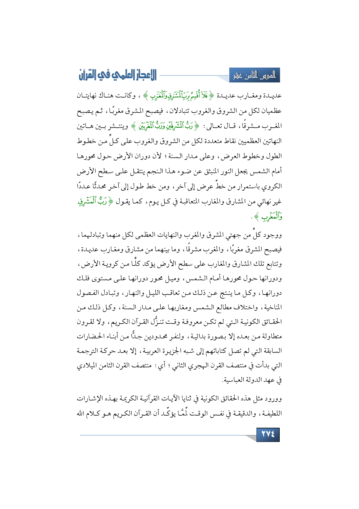 ووجود كلٍّ من جهتي المشرق والمغرب والنهايات العظمى لكل منهما وتبادلهما، فيصبح المشرق مغربًا، والمغرب مشرقًا، وما بينهما من مشارق ومغارب عديدة، وتتابع تلك المشارق والمغارب على سطح الأرض يؤكد كلًّا من كروية الأرض، ودورانها حول محورها أمام الشمس، وميل محور دورانها على مستوى فلك دورانها، وكل ما ينتج عن ذلك من تعاقب الليل والنهار، وتبادل الفصول المناخية، واختلاف مطالع الشمس ومغاربها على مدار السنة، وكل ذلك من الحقائق الكونية التي لم تكن معروفة وقت تنزُّل القرآن الكريم، ولا لقرون متطاولة من بعده إلا بصورة بدائية، ولنفر محدودين جدًّا من أبناء الحضارات السابقة التي لم تصل كتاباتهم إلى شبه الجزيرة العربية، إلا بعد حركة الترجمة التي بدأت في منتصف القرن الهجري الثاني؛ أي: منتصف القرن الثامن الميلادي في عهد الدولة العباسية.