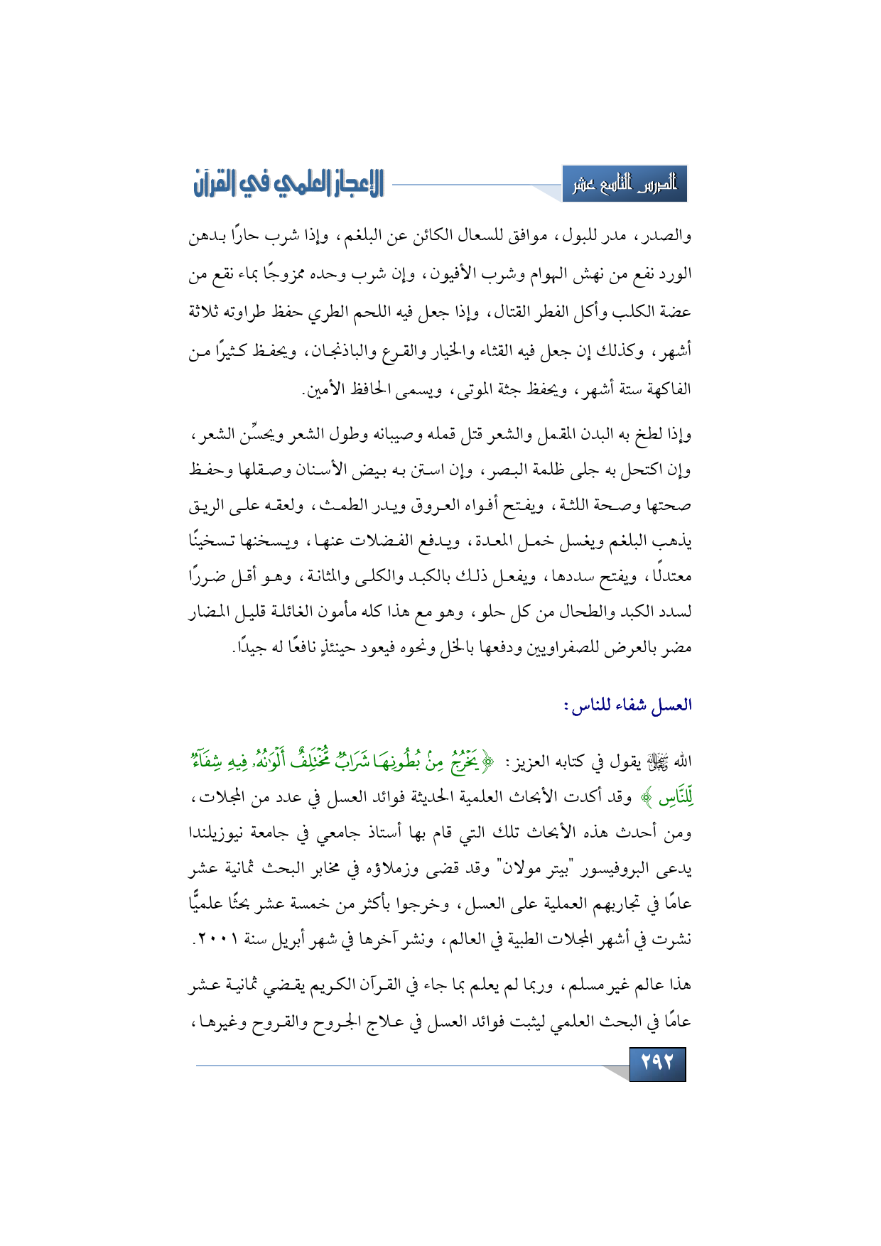 الله - سبحانه وتعالى - يقول في كتابه العزيز: {يَخْرُجُ مِنْ بُطُونِهَا شَرَابٌ مُخْتَلِفٌ أَلْوَانُهُ فِيهِ شِفَاءٌ لِلنَّاسِ} وقد أكدت الأبحاث العلمية الحديثة فوائد العسل في عدد من المجلات، ومن أحدث هذه الأبحاث تلك التي قام بها أستاذ جامعي في جامعة نيوزيلندا يدعى البروفيسور " بيتر م ولان " وقد قضى وزملا ؤ هـ في مخابر البحث ثمانية عشر عامًا في تجاربهم العملية على العسل، وخرجوا بأكثر من خمسة عشر بحثًا علمي ًّ انشرت في أشهر المجلات الطبية في العالم، ونشر آخرها في شهر أبريل سنة 2001.