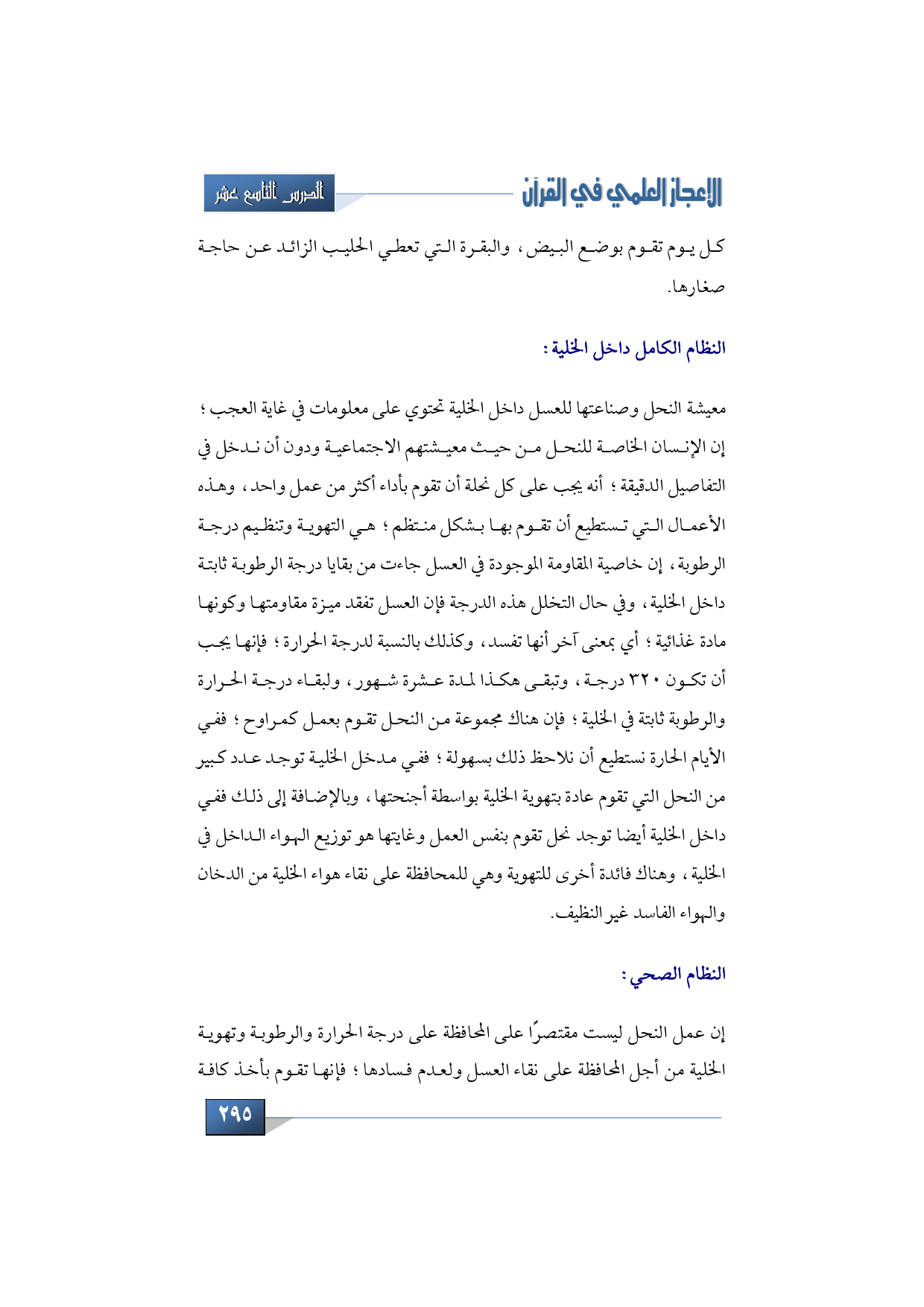 معيشة النحل وصناعتها للعسل داخل الخلية تحتوي على معلومات في غاية العجب؛ إن الإنسان الخاص ة للنحل من حيث معيشتهم الاجتماعية ودون أن ندخل في التفاصيل الدقيقة؛ أنه يجب على كل نحلة أن تقوم ب أداء أكثر من عمل واحد، وهذه الأعمال التي تستطيع أن تقوم بها بشكل منتظم؛ هي التهوية وتنظيم درجة الرطوبة، إن خاصية المقاومة الموجودة في العسل جاءت من بقايا درجة الرطوبة ثابتة داخل الخلية، وفي حال التخلل هذه الدرجة فإن العسل تفقد ميزة مقاومتها وكونها مادة غذائية؛ أي بمعنى آخر أنها تفسد، وكذلك بالنسبة لدرجة الحرارة؛ فإ نها يجب أن تكون 320 درجة، وتبقى هكذا لمدة عشرة شهور، ول بقاء درجة الحرارة والرطوبة ثابتة في الخلية؛ فإن هناك مجموعة من النحل تقوم بعمل كمراوح؛ ففي الأيام الحارة نستطيع أن نلاحظ ذلك بسهولة؛ ففي مدخل الخلية ت وجد عدد كبير من النحل التي تقوم عادة بتهوية الخلية بواسطة أجنحتها، وبالإضافة إلى ذلك ففي داخل الخلية أيضا ت وجد نحل ت قوم بنفس العمل وغايتها هو توزيع الهواء الداخل في الخلية، وهناك فائدة أخرى للتهوية وهي للمحافظة على نقاء هواء الخلية من الدخان والهواء الفاسد غير النظيف.