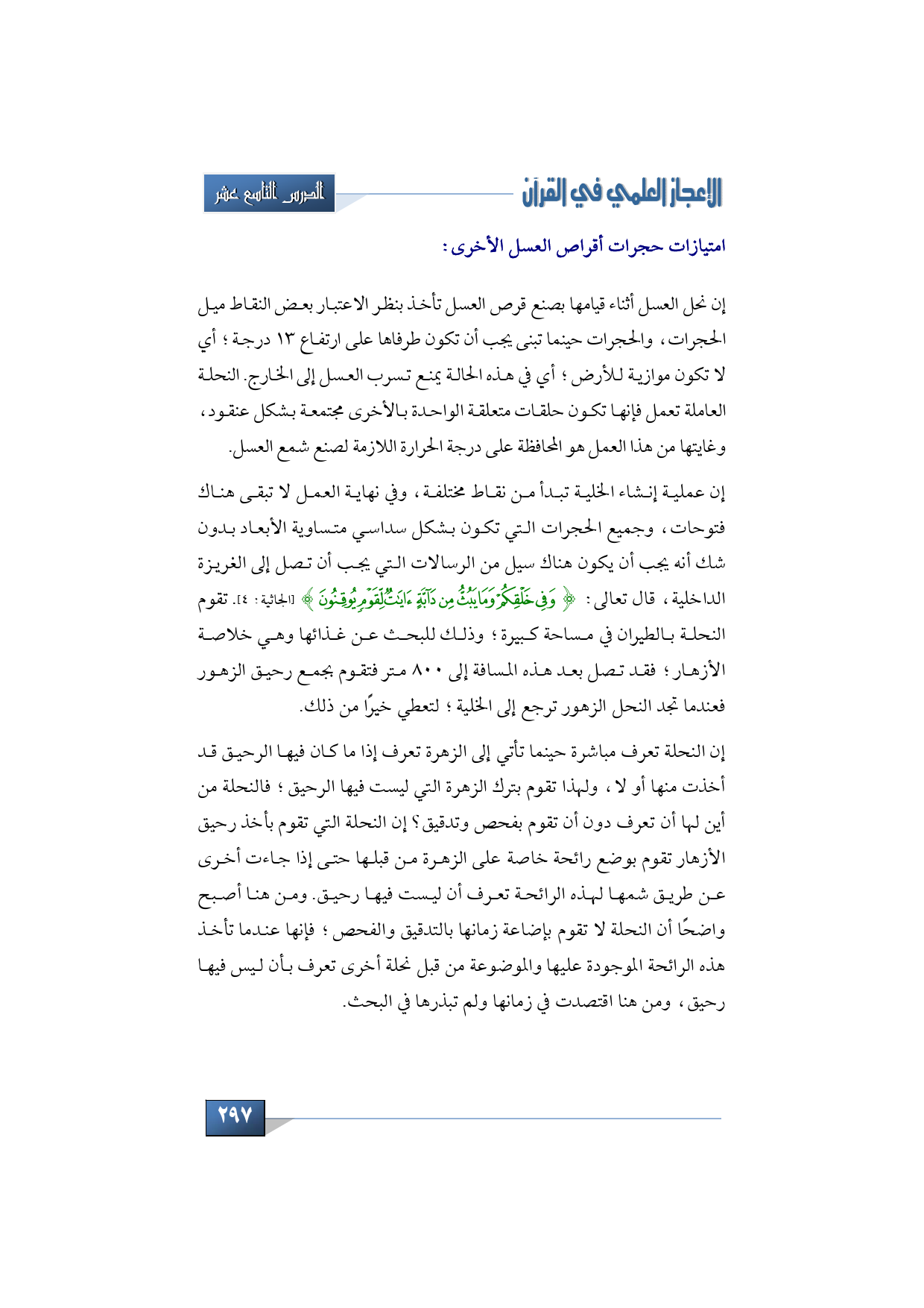 إن عملية إنشاء الخلية تبدأ من نقاط مختلفة، وفي نهاية العمل لا تبقى هناك فتوحات، وجميع الحجرات التي تكون بشكل سداسي متساوية الأبعاد بدون شك أنه يجب أن يكون هناك سيل من الرسالات التي يجب أن تصل إلى الغريزة الداخلية، قال تعالى: {وَفِي خَلْقِكُمْ وَمَا يَبُثُّ مِنْ دَابَّةٍ آيَاتٌ لِقَوْمٍ يُوقِنُونَ} (الجاثية: 4). تقوم النحلة بالطيران في مساحة كبيرة؛ وذلك للبحث عن غذائها وهي خلاصة الأزهار؛ فقد تصل بعد هذه المسافة إلى 800 متر فتقوم بجمع رحيق الزهور فعندما تجد النحل الزهور ترجع إلى الخلية؛ ل تعطي خيرًا من ذلك.