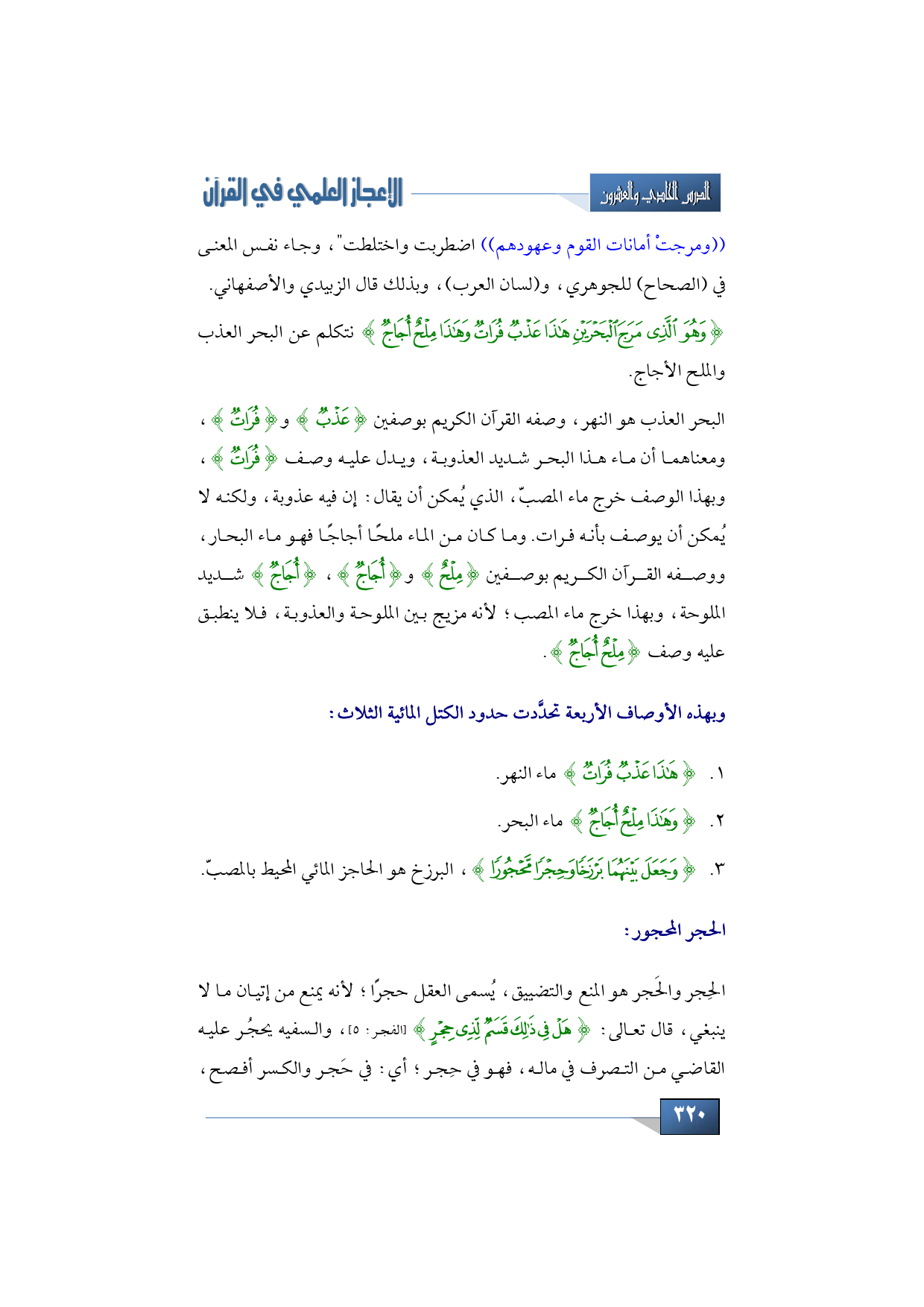 البحر العذب هو النهر، وصفه القرآن الكريم بوصفين {عَذْبٌ} و {فُرَاتٌ}، ومعناهما أن ماء هذا البحر شديد العذوبة، ويدل عليه وصف {فُرَاتٌ}، وبهذا الوصف خرج ماء المصبّ، الذي يُمكن أن يقال: إن فيه عذوبة، ولكنه لا يُمكن أن يوصف بأنه فرات. وما كان من الماء ملحًا أجاجًا فهو ماء البحار، ووصفه القرآن الكريم بوصفين {مِلْحٌ} و {أُجَاجٌ}، {أُجَاجٌ} شديد الملوحة، وبهذا خرج ماء المصب؛ لأنه مزيج بين الملوحة والعذوبة، فلا ينطبق عليه وصف {مِلْحٌ أُجَاجٌ}.