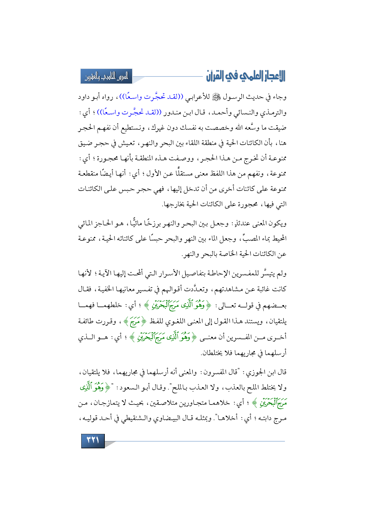 وجاء في حديث الرسول -صلى الله عليه وسلم- للأعرابي ((لقد تحجَّرت واسعًا))، رواه أبو داود والترمذي والنسائي وأحمد، قال ابن مندور ((لقد تحجَّرت واسعًا))؛ أي: ضيقت ما وسَّعه الله وخصصت به نفسك دون غيرك، ونستطيع أن نفهم الحجر هنا، بأن الكائنات الحية في منطقة اللقاء بين البحر والنهر، تعيش في حجر ضيق ممنوعة أن تخرج من هذا الحجر، ووصفت هذه المنطقة بأنها محجورة؛ أي: ممنوعة، ونفهم من هذا اللفظ معنى مستقلًّا عن الأول؛ أي: أنها أيضًا منقطعة ممنوعة على كائنات أخرى من أن تدخل إليها، فهي حجر حبس على الكائنات التي فيها، محجورة على الكائنات الحية بخارجها.