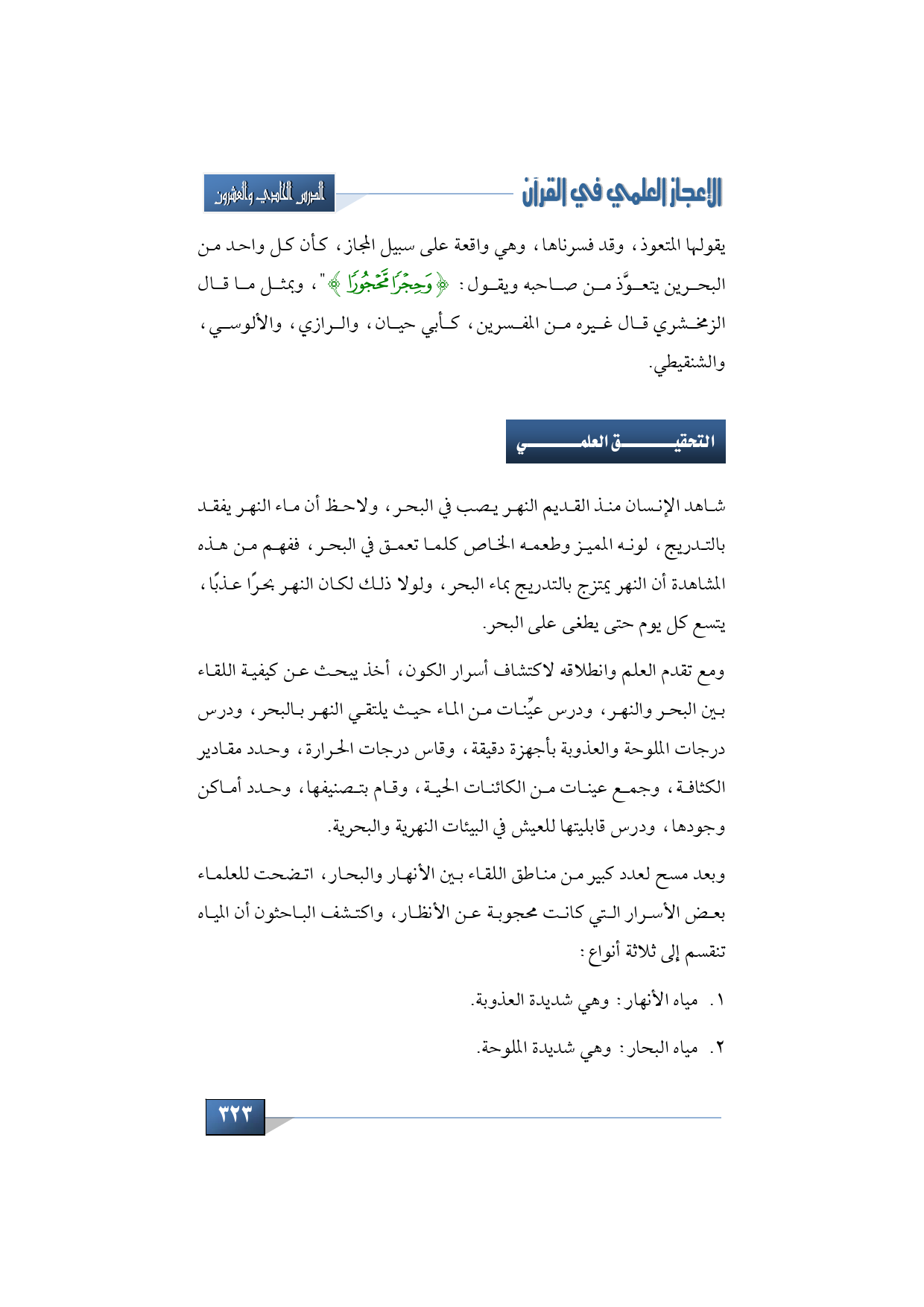 ومع تقدم العلم وانطلاقه لاكتشاف أسرار الكون، أخذ يبحث عن كيفية اللقاء بين البحر والنهر، ودرس عيِّنات من الماء حيث يلتقي النهر بالبحر، ودرس درجات الملوحة والعذوبة بأجهزة دقيقة، وقاس درجات الحرارة، وحدد مقادير الكثافة، وجمع عينات من الكائنات الحية، وقام بتصنيفها، وحدد أماكن وجودها، ودرس قابليتها للعيش في البيئات النهرية والبحرية.