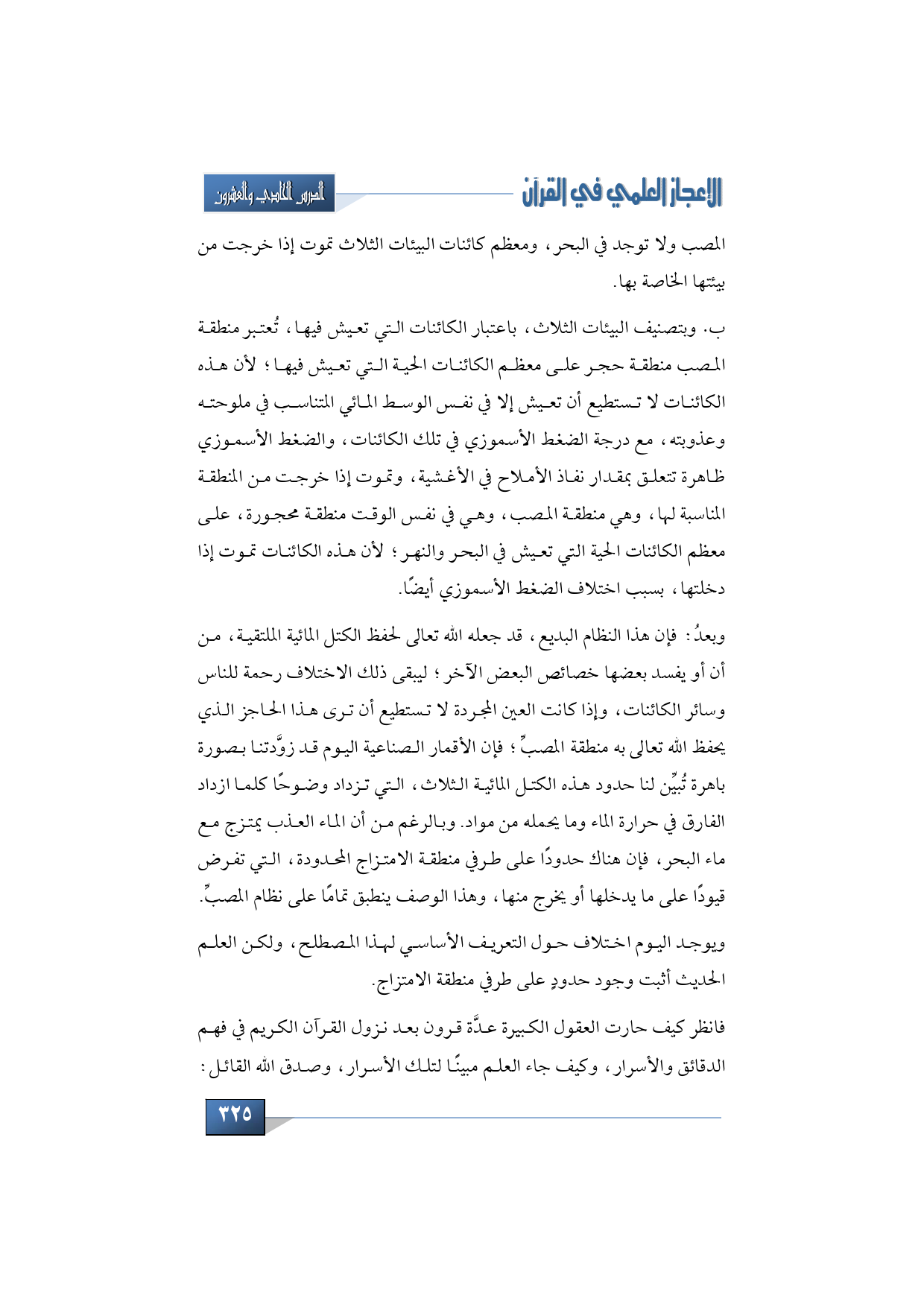 وبعدُ: فإن هذا النظام البديع، قد جعله الله تعالى لحفظ الكتل المائية الملتقية، من أن يفسد بعضها خصائص البعض الآخر؛ ليبقى ذلك الاختلاف رحمة للناس وسائر الكائنات، وإذا كانت العين المجردة لا تستطيع أن ترى هذا الحاجز الذي يحفظ الله تعالى به منطقة المصبِّ؛ فإن الأقمار الصناعية اليوم قد زوَّدتنا بصورة باهرة تُبيِّن لنا حدود هذه الكتل المائية الثلاث، التي تزداد وضوحًا كلما ازداد الفارق في حرارة الماء وما يحمله من مواد. وبالرغم من أن الماء العذب يمتزج مع ماء البحر، فإن هناك حدودًا على طرفي منطقة الامتزاج المحدودة، التي تفرض قيودًا على ما يدخلها أو يخرج منها، وهذا الوصف ينطبق تمامًا على نظام المصبِّ.