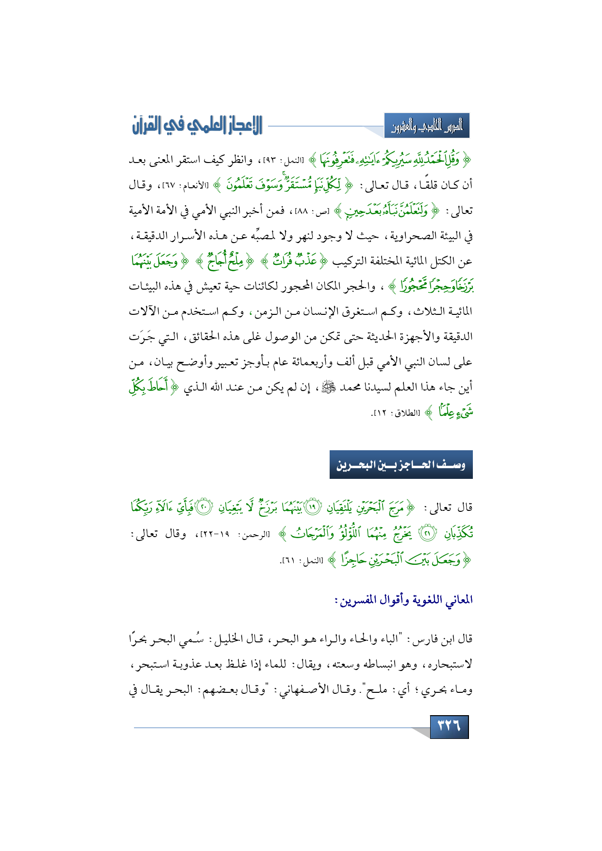 قال تعالى: {مَرَجَ الْبَحْرَيْنِ يَلْتَقِيَانِ * بَيْنَهُمَا بَرْزَخٌ لَا يَبْغِيَانِ * فَبِأَيِّ آلَاءِ رَبِّكُمَا تُكَذِّبَانِ * يَخْرُجُ مِنْهُمَا اللُّؤْلُؤُ وَالْمَرْجَانُ} (الرحمن: 19 - 22)، وقال تعالى: {وَجَعَلَ بَيْنَ الْبَحْرَيْنِ حَاجِزًا} (النمل: 61).