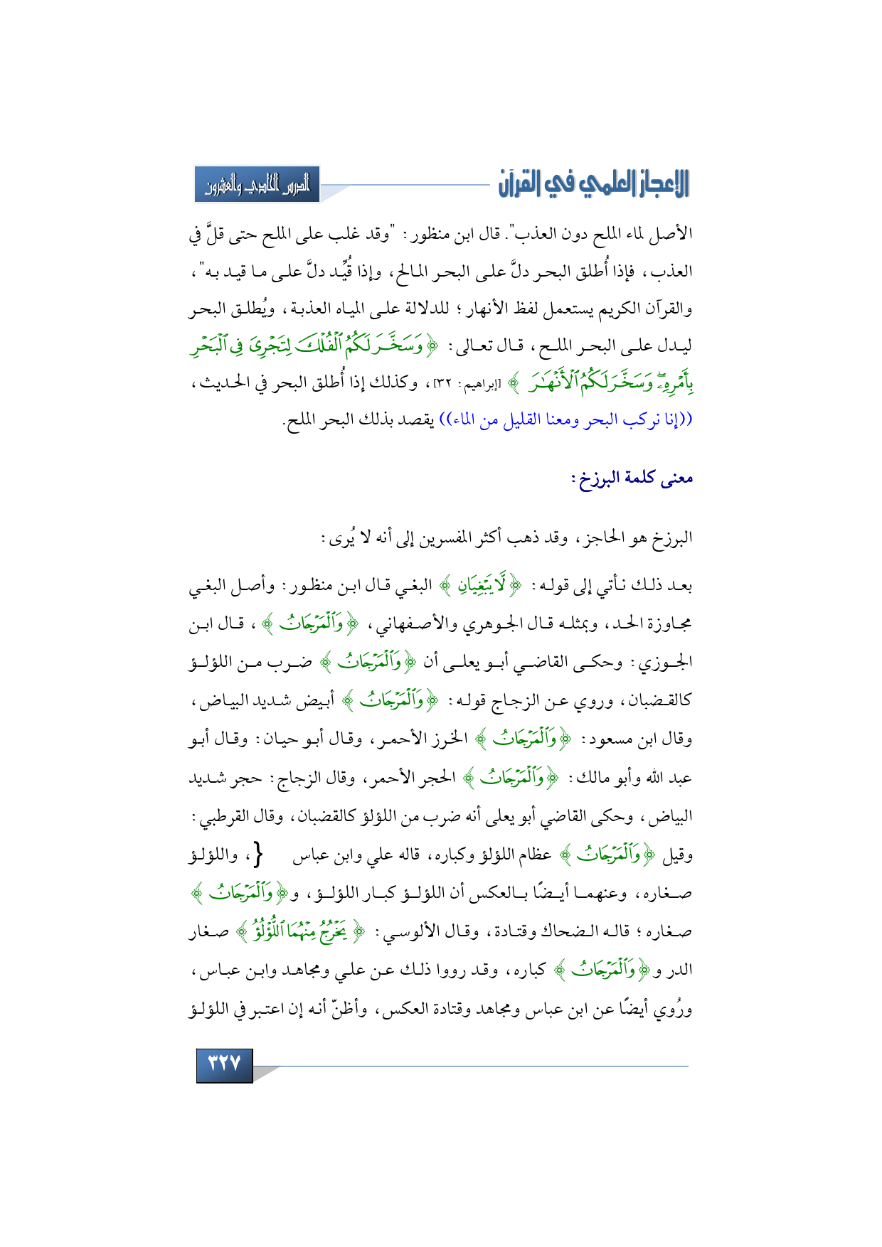 بعد ذلك نأتي إلى قوله: {لَا يَبْغِيَانِ} البغي قال ابن منظور: وأصل البغي مجاوزة الحد، وبمثله قال الجوهري والأصفهاني، {الْمَرْجَانُ}، قال ابن الجوزي: وحكى القاضي أبو يعلى أن {الْمَرْجَانُ} ضرب من اللؤلؤ كالقضبان، وروي عن الزجاج قوله: {الْمَرْجَانُ} أبيض شديد البياض، وقال ابن مسعود: {الْمَرْجَانُ} الخرز الأحمر، وقال أبو حيان: وقال أبو عبد الله وأبو مالك: {الْمَرْجَانُ} الحجر الأحمر، وقال الزجاج: حجر شديد البياض، وحكى القاضي أبو يعلى أنه ضرب من اللؤلؤ كالقضبان، وقال القرطبي: وقيل {الْمَرْجَانُ} عظام اللؤلؤ وكباره، قاله علي وابن عباس -رضي الله عنهما، واللؤلؤ صغاره، وعنهما أيضًا بالعكس أن اللؤلؤ كبار اللؤلؤ، و {الْمَرْجَانُ} صغاره؛ قاله الضحاك وقتادة، وقال الألوسي: {يَخْرُجُ مِنْهُمَا اللُّؤْلُؤُ} صغار الدر و {الْمَرْجَانُ} كباره، وقد رووا ذلك عن علي ومجاهد وابن عباس، ورُوي أيضًا عن ابن عباس ومجاهد وقتادة العكس، وأظنّ أنه إن اعتبر في اللؤلؤ