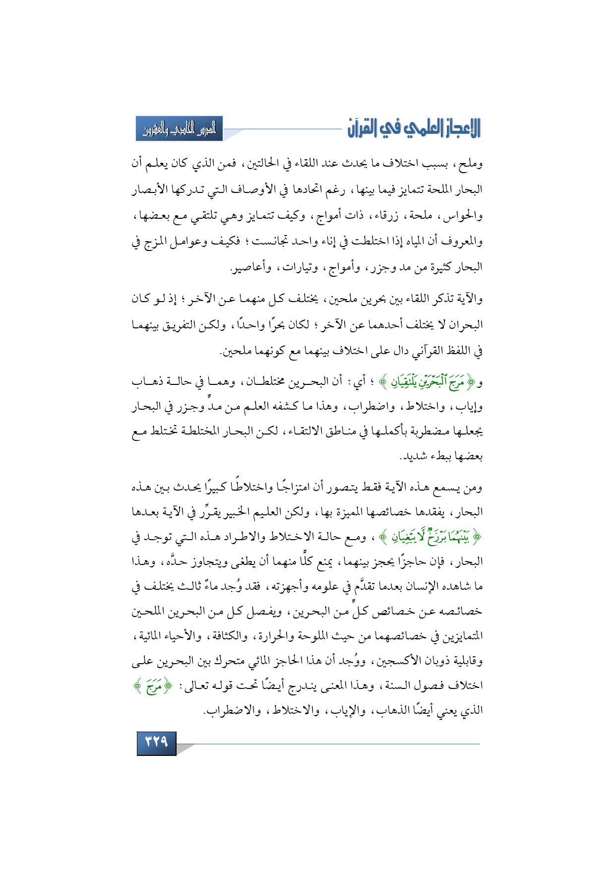 ومن يسمع هذه الآية فقط يتصور أن امتزاجًا واختلاطًا كبيرًا يحدث بين هذه البحار، يفقدها خصائصها المميزة بها، ولكن العليم الخبير يقرِّر في الآية بعدها {بَيْنَهُمَا بَرْزَخٌ لَا يَبْغِيَانِ}، ومع حالة الاختلاط والاطراد هذه التي توجد في البحار، فإن حاجزًا يحجز بينهما، يمنع كلًّا منهما أن يطغى ويتجاوز حدَّه، وهذا ما شاهده الإنسان بعدما تقدَّم في علومه وأجهزته، فقد وُجد ماءٌ ثالث يختلف في خصائصه عن خصائص كلٍّ من البحرين، ويفصل كل من البحرين الملحين المتمايزين في خصائصهما من حيث الملوحة والحرارة، والكثافة، والأحياء المائية، وقابلية ذوبان الأكسجين، ووُجد أن هذا الحاجز المائي متحرك بين البحرين على اختلاف فصول السنة، وهذا المعنى يندرج أيضًا تحت قوله تعالى: {مَرَجَ} الذي يعني أيضًا الذهاب، والإياب، والاختلاط، والاضطراب.