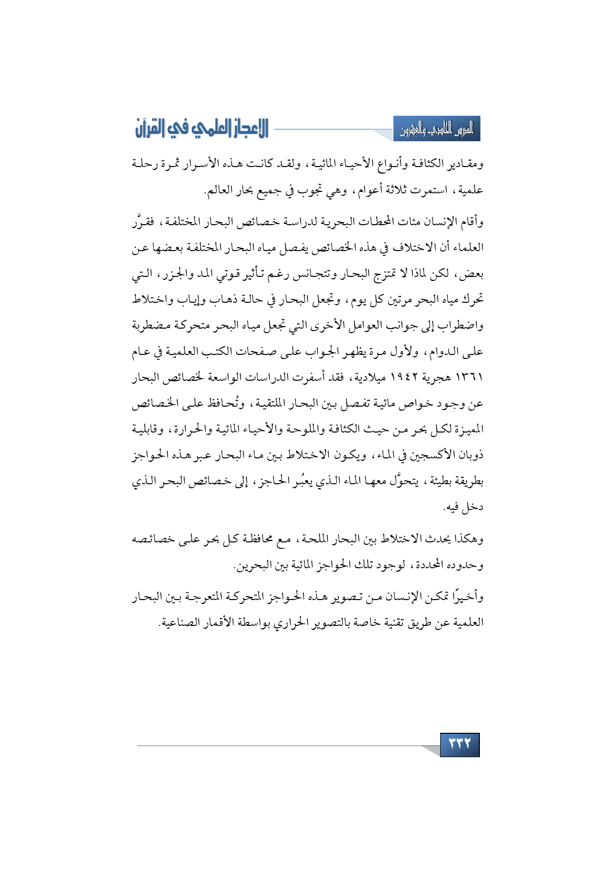وأقام الإنسان مئات المحطات البحرية لدراسة خصائص البحار المختلفة، فقرَّر العلماء أن الاختلاف في هذه الخصائص يفصل مياه البحار المختلفة بعضها عن بعض، لكن لماذا لا تمتزج البحار وتتجانس رغم تأثير قوتي المد والجزر، التي تحرك مياه البحر مرتين كل يوم، وتجعل البحار في حالة ذهاب وإياب واختلاط واضطراب إلى جوانب العوامل الأخرى التي تجعل مياه البحر متحركة مضطربة على الدوام، ولأول مرة يظهر الجواب على صفحات الكتب العلمية في عام 1361 هجرية 1942 ميلادية، فقد أسفرت الدراسات الواسعة لخصائص البحار عن وجود خواص مائية تفصل بين البحار الملتقية، وتُحافظ على الخصائص المميزة لكل بحر من حيث الكثافة والملوحة والأحياء المائية والحرارة، وقابلية ذوبان الأكسجين في الماء، ويكون الاختلاط بين ماء البحار عبر هذه الحواجز بطريقة بطيئة، يتحوَّل معها الماء الذي يعبُر الحاجز، إلى خصائص البحر الذي دخل فيه.